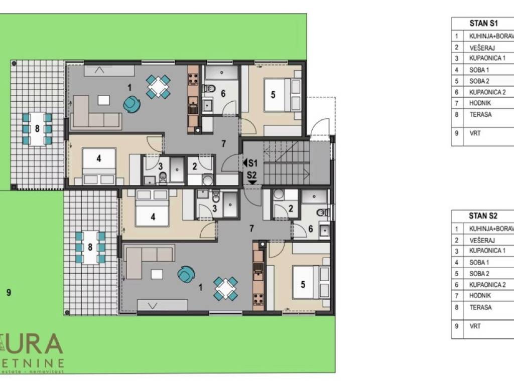 Sastoji se od: dvije spavaće sobe, dnevnog boravka + kuhinja + blagovaona, hodnika, vešeraja, dvije kupaonice i terase.