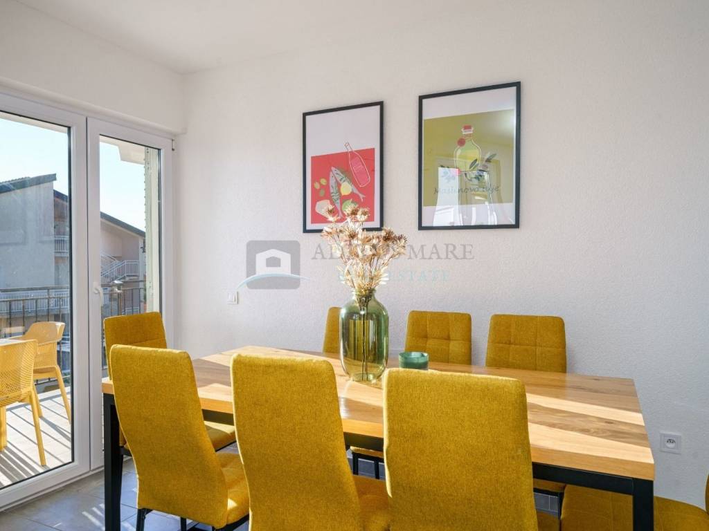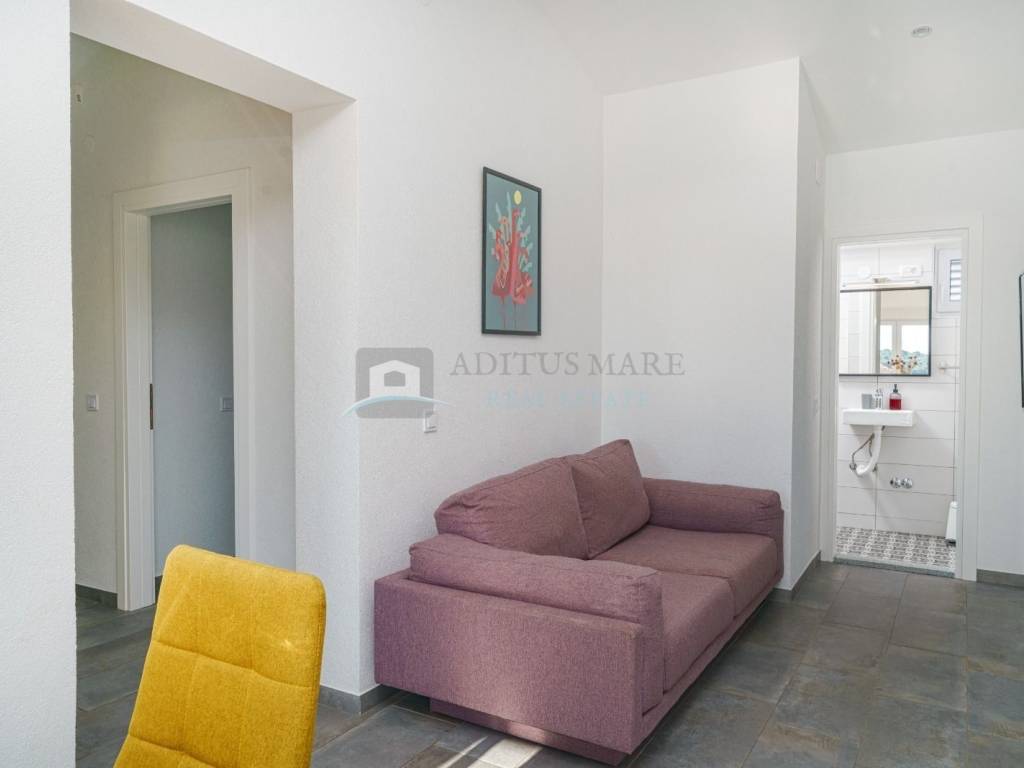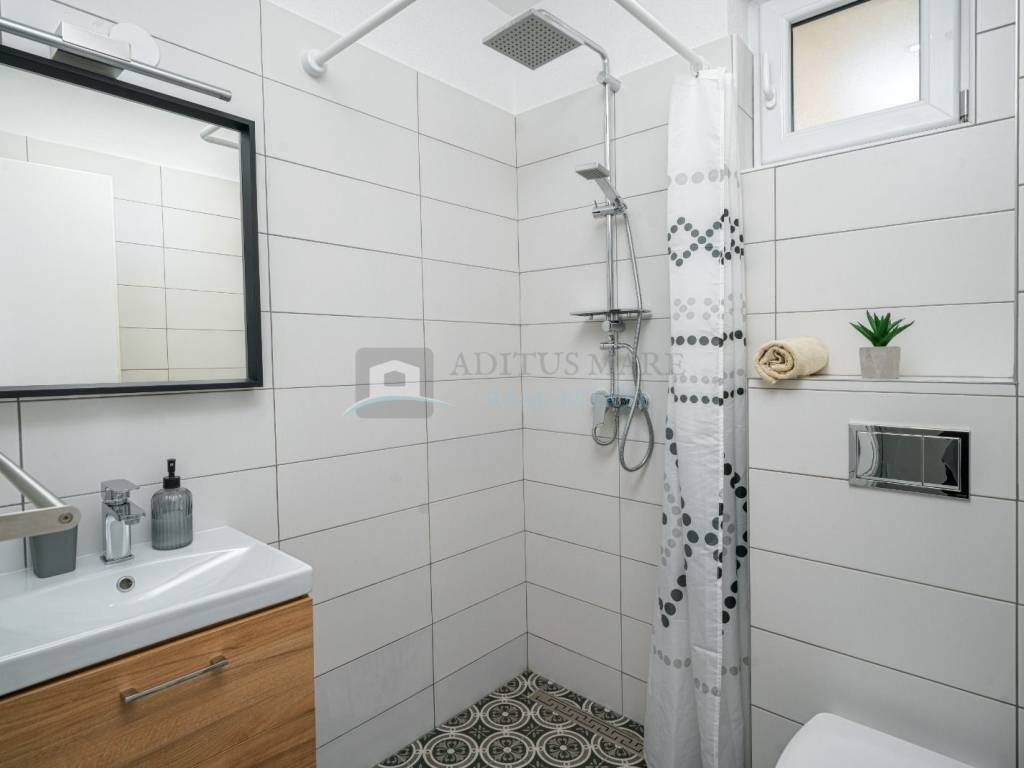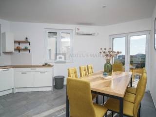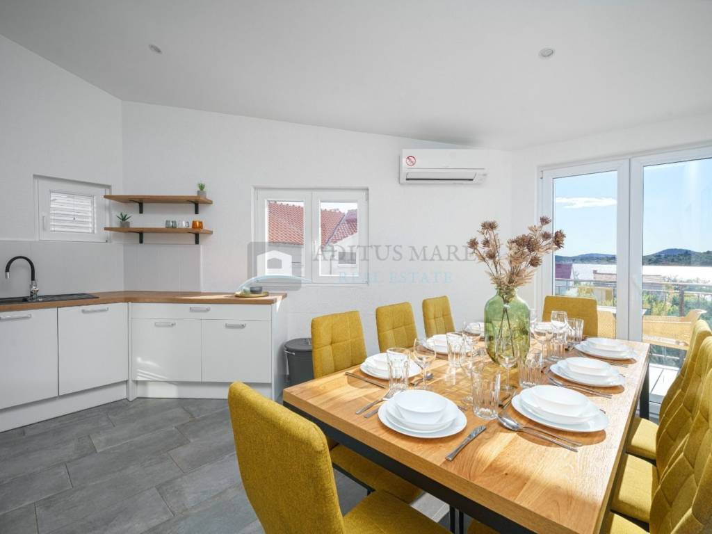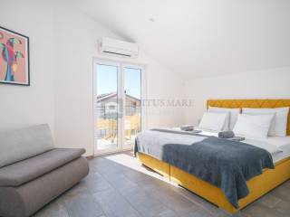 Na prodaju kuća s apartmanima u Srimi, samo 130 metara udaljena od mora. Kuća se prostire na prizemlje, prvi i drugi kat. U prizemlju su dva apartmana s dvije spavaće sobe, kuhinjom, dnevnim boravkom, kupaonom te izlazom na terasu.