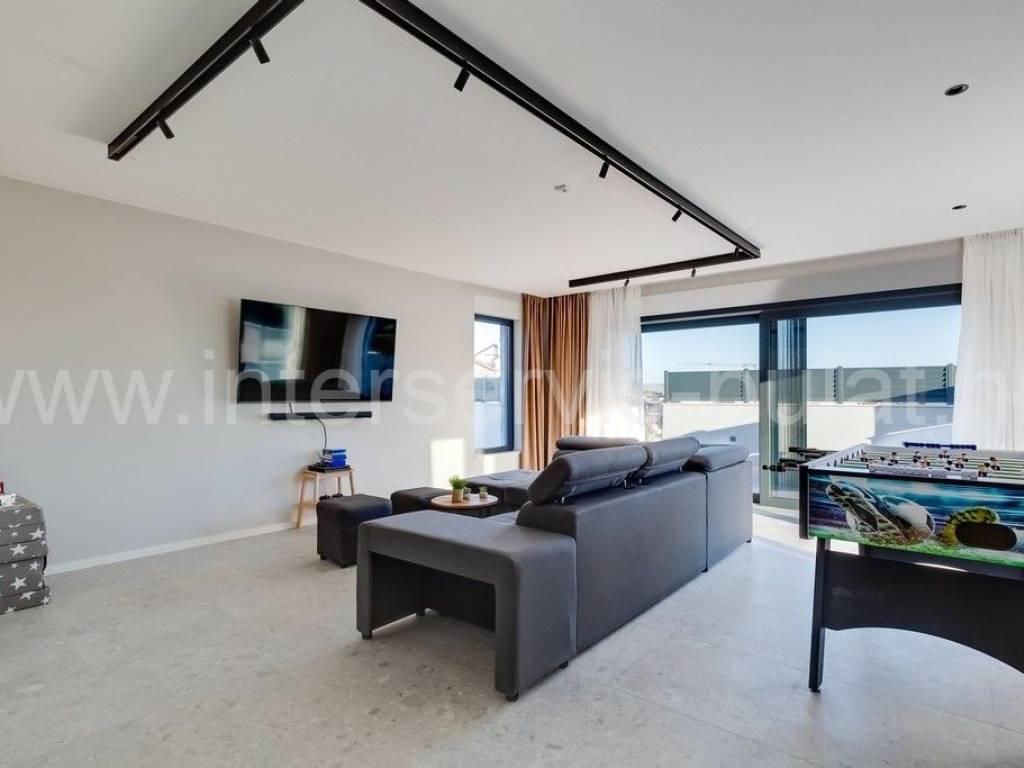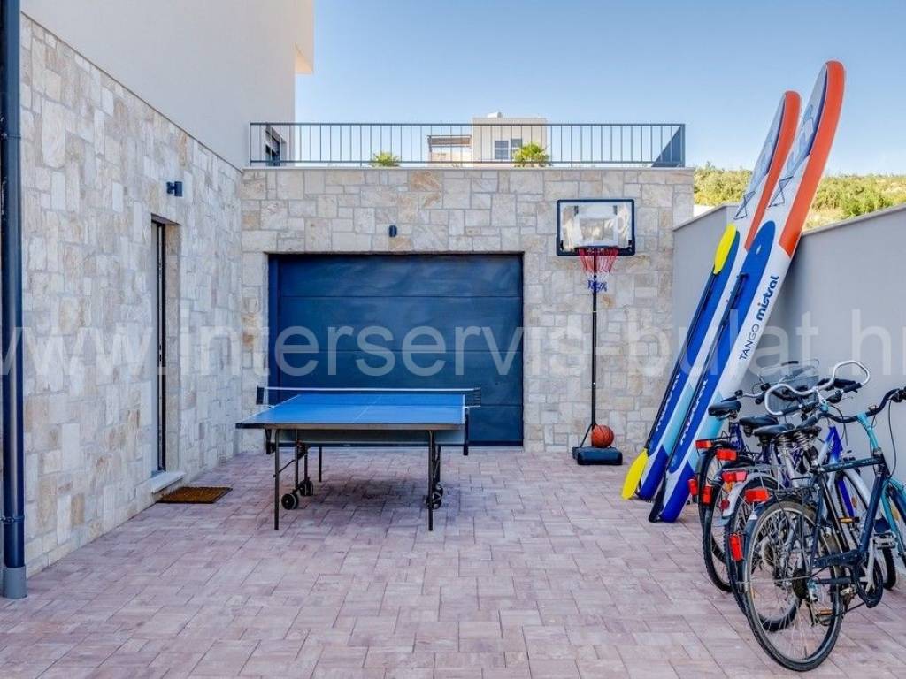 The basement of the house is designed for entertainment and relaxation, so in addition to a comfortable kitchen with a dining room and a bathroom, it also contains a room for relaxation with table football or television. It also has a table tennis table and a basketball hoop for recreation in front of the garage, which is also part of the basement, and for additional relaxation there is a heated 30 sqm swimming pool. This floor also includes a laundry room and a machine room.