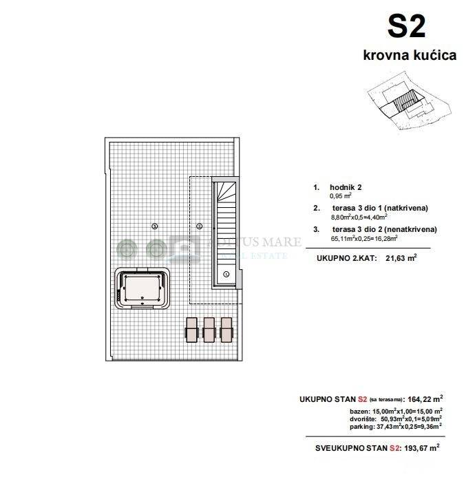 Ukupna neto površina stana iznosi cca 164 m, dok ukupna obračunska površina s pripadcima iznosi cca 194 m, uključujući: