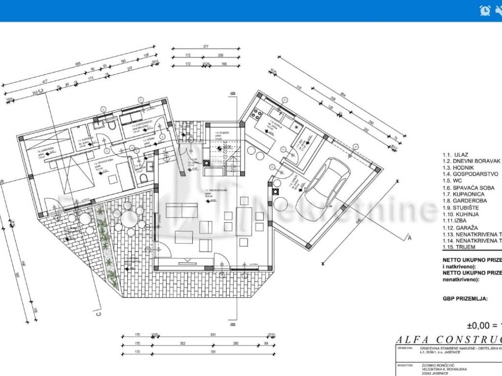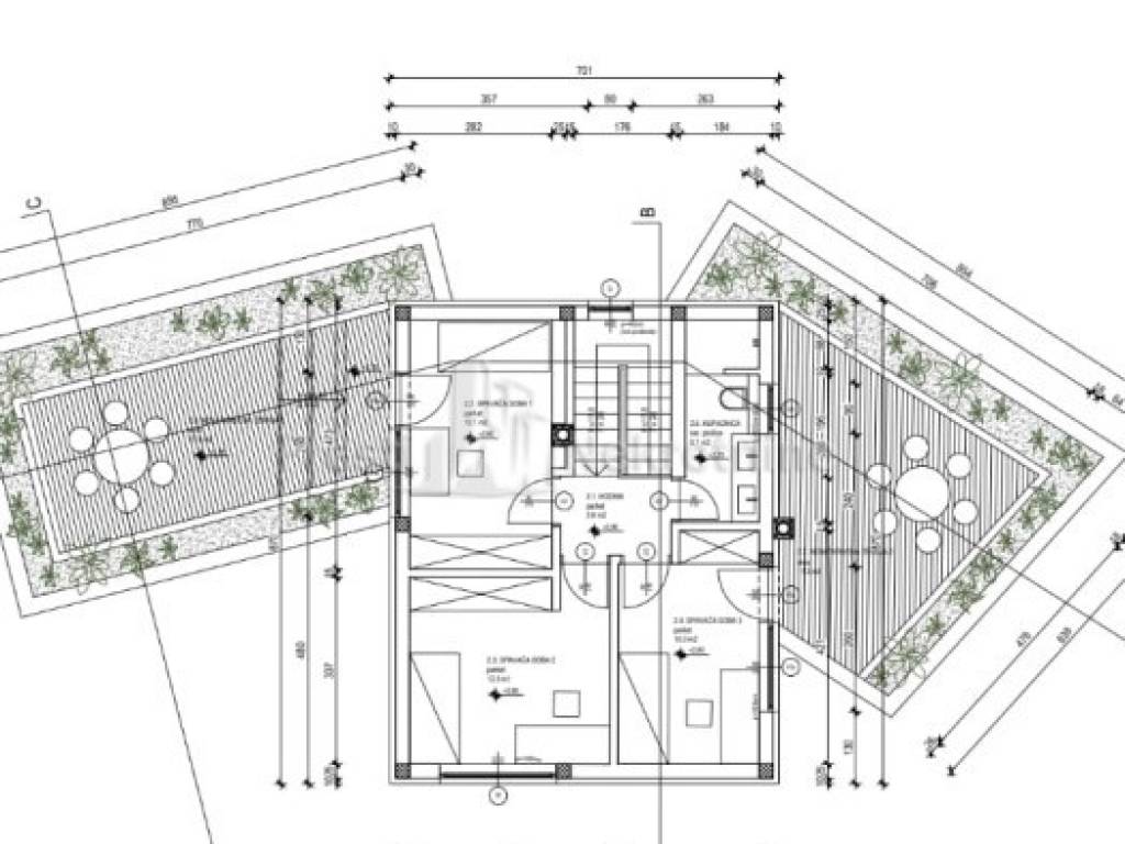 Površina parcele je 457 m2, a novosagrađeni objekt prema projektnoj dokumentaciji 187 m2 netto. ( Uvid u dokumentaciju moguć u agenciji uz prethodni dogovor termina)