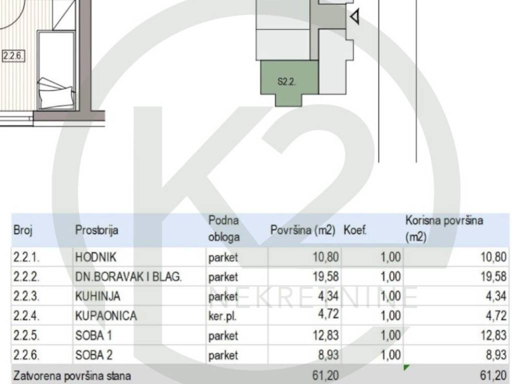 Stan ima 66,94 m2 obračunske površine, korisne površine 72,68 m2, a sastoji se od hodnika, DB+BL, kuhinja, kupaonica, predsoblje, spavaća soba i balkon.