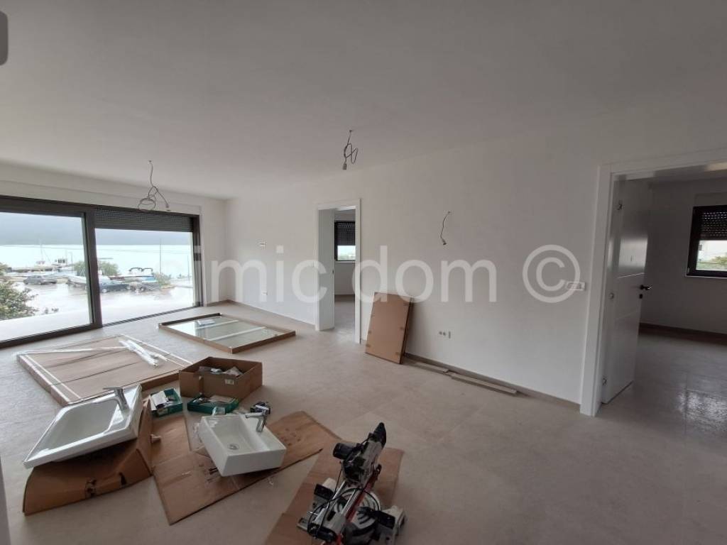 We mediate in the sale of an excellent, very spacious apartment in a quiet location near the Marina. The apartment is located in a building that will be completely completed in a few weeks, and is located on the first floor of a building with only three apartments, thus guaranteeing exceptional peace and privacy. The net area of the apartment is 74m2 and has two bedrooms, two bathrooms, an additional toilet, a large living room with kitchen and dining room and an impressive terrace with an unobstructed, open view of the sea and the surrounding area. This is a new building of exceptional quality and very modern decoration, which is visible through carefully selected sanitary ware, tiles, floor coverings, interior joinery... The price of the apartment also includes one outdoor parking space, while the location right by the sea and the beautiful beaches of this area guarantees a number of possibilities for the use of the property: a quiet family destination or for a rental business. Ownership is in order.