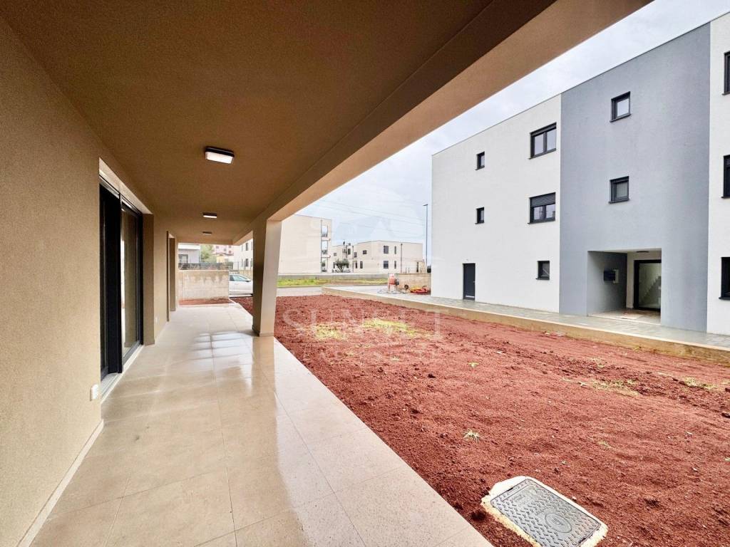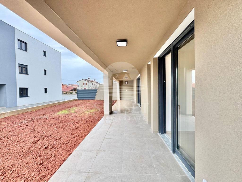 È in vendita un attraente appartamento moderno con giardino, situato in una zona tranquilla vicino a Umago. Lappartamento ha una superficie netta di 123 m e si trova in un edificio residenziale con un totale di sei unità abitative.