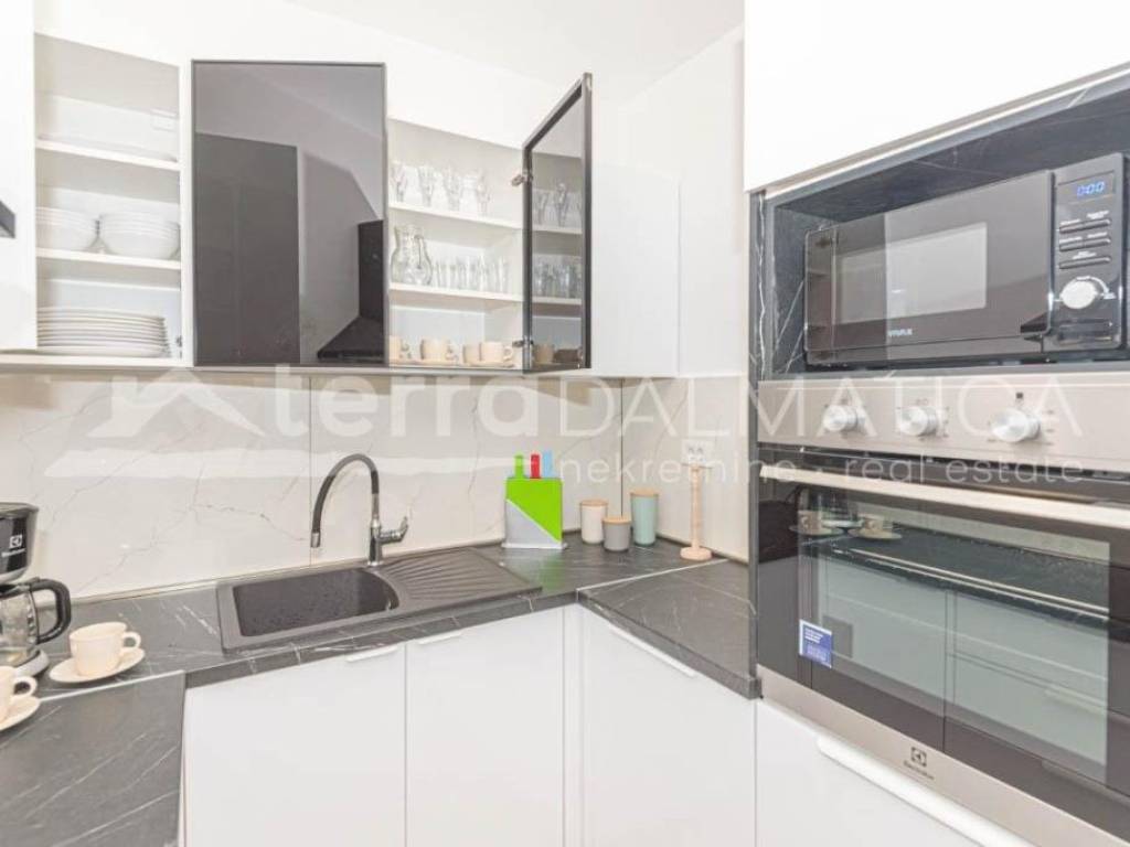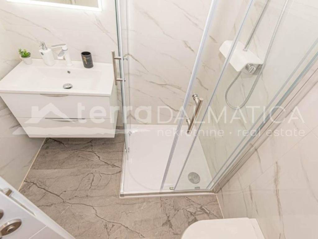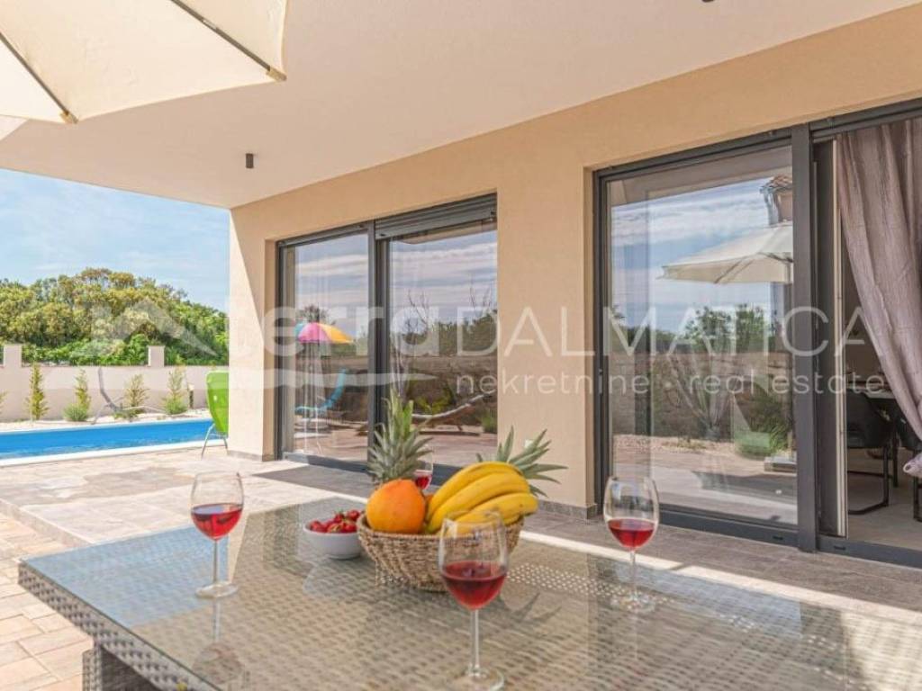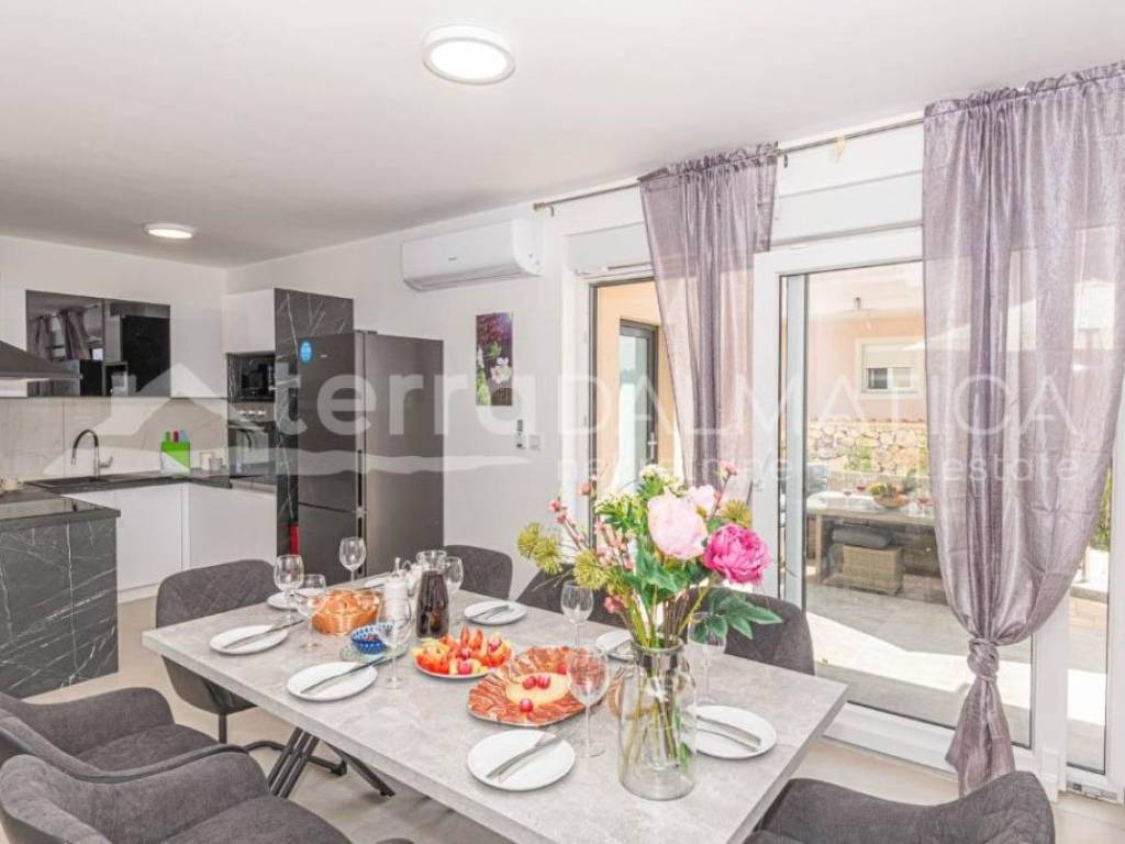 In the vicinity of Sibenik, in Bogdanovici, a semi-detached house with a swimming pool is for sale in a quiet location. The house is spread over two floors. On the ground floor there is an entrance area, a bathroom, a storage room, a kitchen with a dining room and a living room with access to the terrace, and a bedroom. There is also a separate summer kitchen and swimming pool on the terrace. The internal staircase leads to the first floor, where there are three bedrooms, one of which has its own bathroom and dressing room, and the other two have access to the balcony and terrace. Top quality materials and equipment were used in the construction of the house. Underfloor heating will be installed in the bathrooms, all rooms will be air-conditioned, and a fireplace will be installed in the living room. The house is sold fully furnished. Bogdanovici is a small settlement near Jadrija, Sibenik's town bathing resort. The town of Sibenik is only 7 km away, and the Krka and Kornati national parks are also nearby. Contact our agent and schedule your tour.