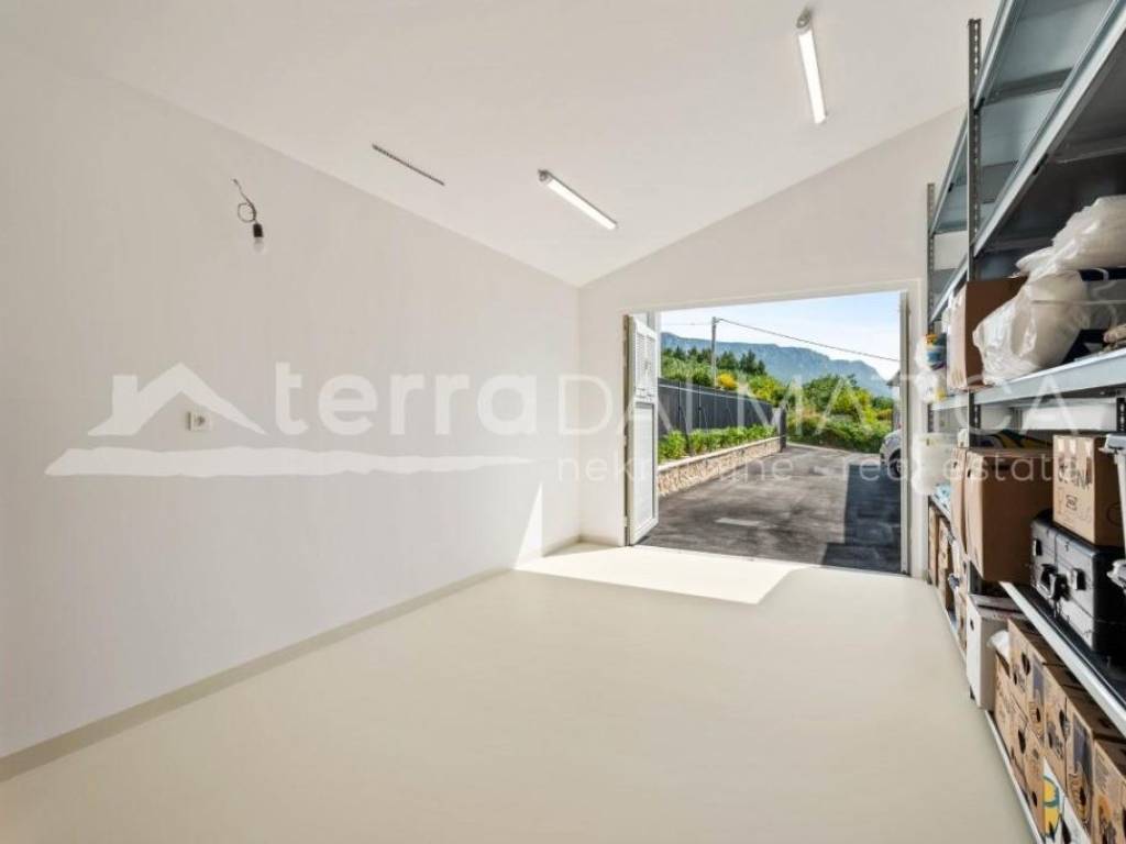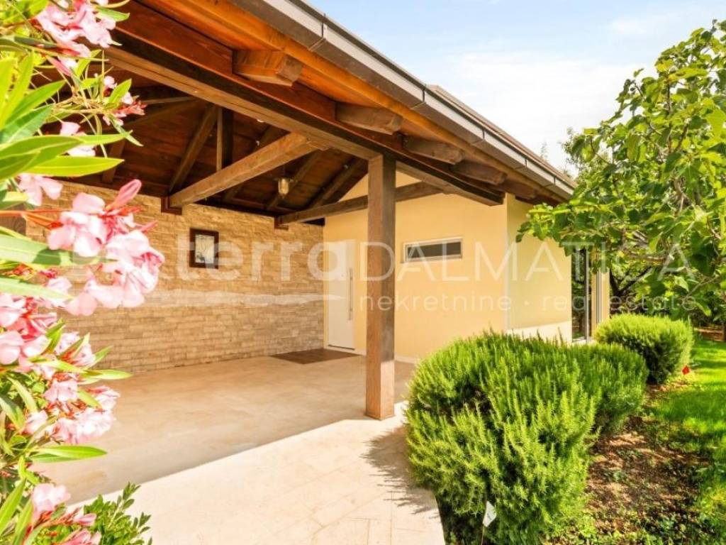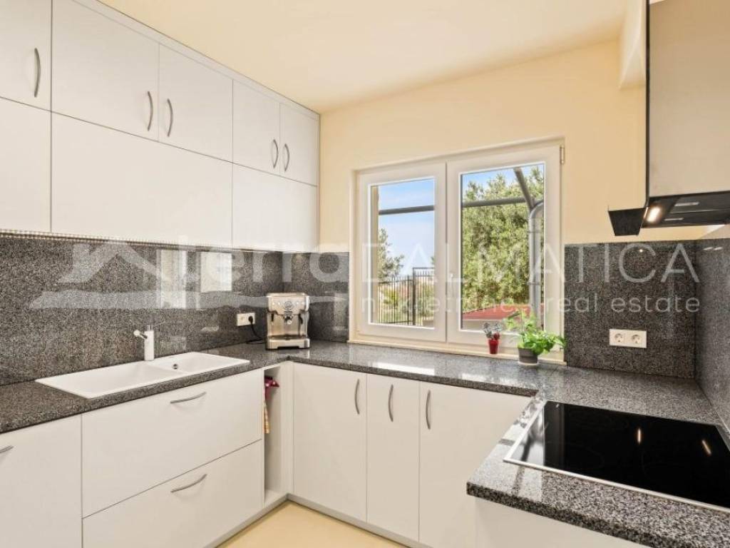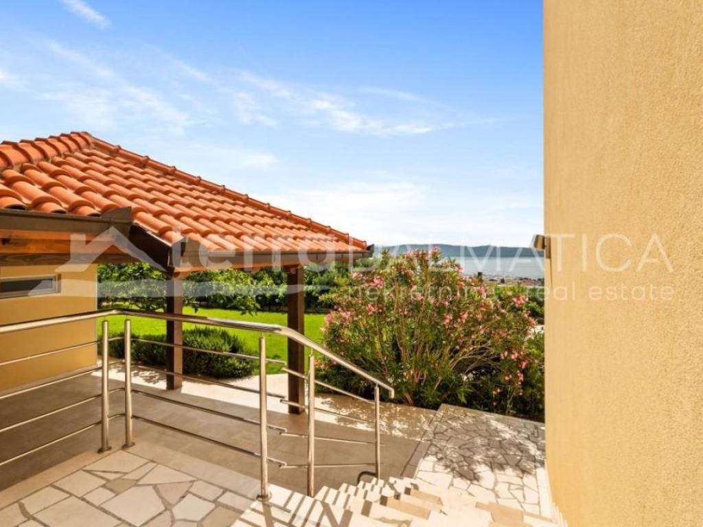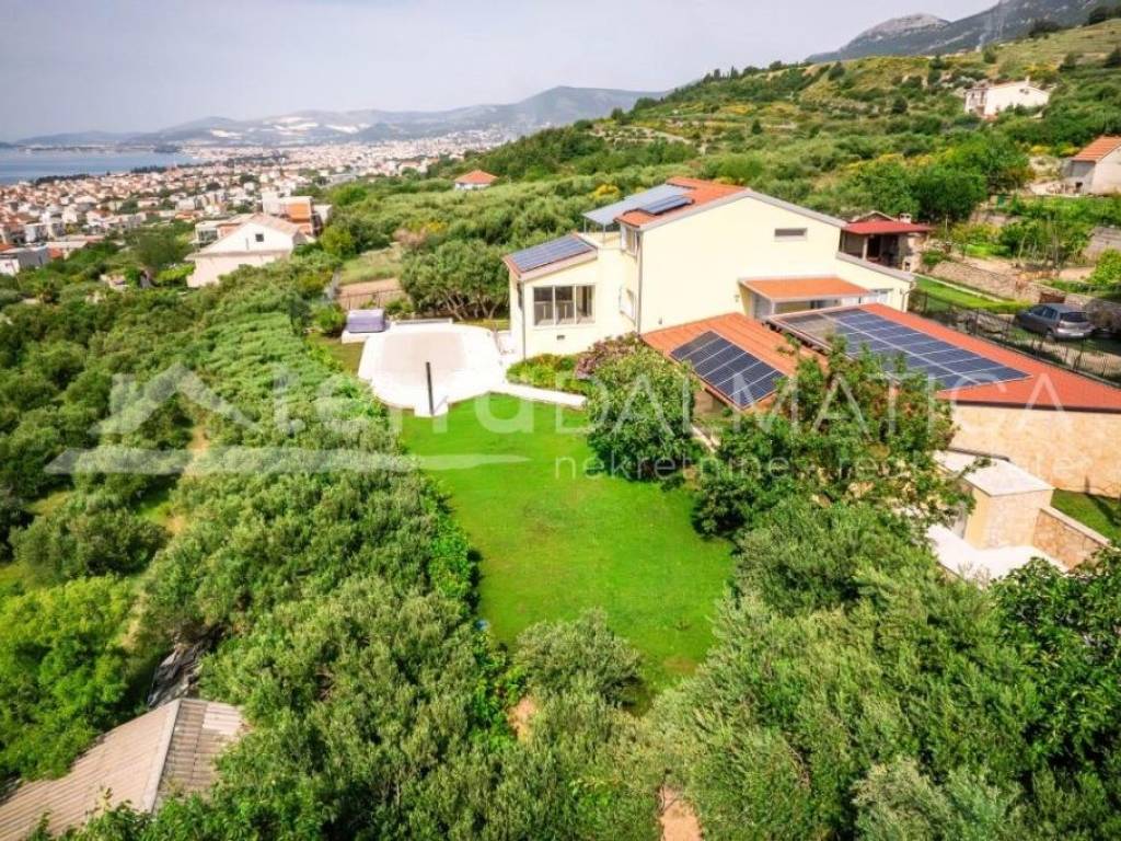 Situated in the picturesque town of Kastel Gomilica, Croatia, this recently renovated villa, under Swiss-German ownership, epitomizes luxury and elegance. Spanning two plots with a combined area of 1,900 m², the property is surrounded by lush greenery and offers stunning views of the Adriatic Sea. The villa's southern and southwest orientation ensures it is bathed in sunlight throughout the day, creating a serene and peaceful ambiance. The main house, spread over two floors, boasts a spacious 184 m². It features four bedrooms, two high-quality bathrooms equipped with Villeroy & Boch fixtures, and two large terraces (22 m² on the ground floor and 28 m² on the upper floor), perfect for enjoying panoramic sea views. The villa includes a separate guest area with its own bathroom, bringing the total living space to over 200 m². This luxurious villa is in excellent condition, having been recently renovated to the highest standards. The kitchen is a chef's dream, equipped with a granite stone countertop, Miele appliances, and a Bosch refrigerator. The open design seamlessly integrates the dining area, making it ideal for entertaining. The villa also includes a utility room and a garage. Energy efficiency and sustainability are key features of this property, with 34 solar panels covering most of the house's energy needs. The house has electric underfloor heating powered by solar energy and is equipped with six air conditioning units for year-round comfort. Special attention has been given to security and privacy. The entire estate is enclosed by a protective fence. A state-of-the-art surveillance system with six video cameras records all movements, ensuring peace of mind. There are three high-security doors and lockable lift-and-slide windows, providing maximum security. The villa offers a wealth of high-quality amenities and finishes. It is partially furnished with premium pieces, including De Sede furniture from Switzerland, HASENA bedding, and a Sicilian lava stone table on the terrace. Custom-built wardrobes in the master bedroom and entrance closet provide ample storage space. Outdoor amenities include a beautiful garden, a luxurious outdoor pool, and a hot tub. The property also boasts a covered carport for four vehicles, with additional parking space for three more cars. It features its own well and a rooftop feed into the well for the irrigation system, as well as two protected rainwater collectors with an 800-liter capacity. The villa is equipped with an intercom system, internet, and satellite TV. Despite its excellent transport connections, the villa is situated in a quiet hillside location, offering complete privacy and an intimate guest apartment. The coastal setting provides the perfect blend of city and sea views, making this luxury villa in Kaštel Gomilica a unique opportunity to own a piece of paradise in Croatia. Its blend of modern amenities, high-quality finishes, and sustainable features make it an exceptional investment for those seeking a private and peaceful lifestyle.