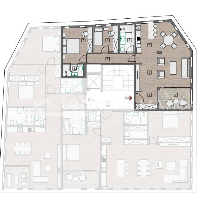 Schedule The apartment has an extremely functional floor plan. It consists of an entrance hall, a bright living room connected to the kitchen and dining room in an open concept, a hallway, two modern bathrooms and two comfortable bedrooms, arranged in a way that ensures privacy and a high level of comfort. The outdoor space consists of a beautiful loggia, ideal for morning coffee, evening rest or relaxation with the view and peace that this location provides.