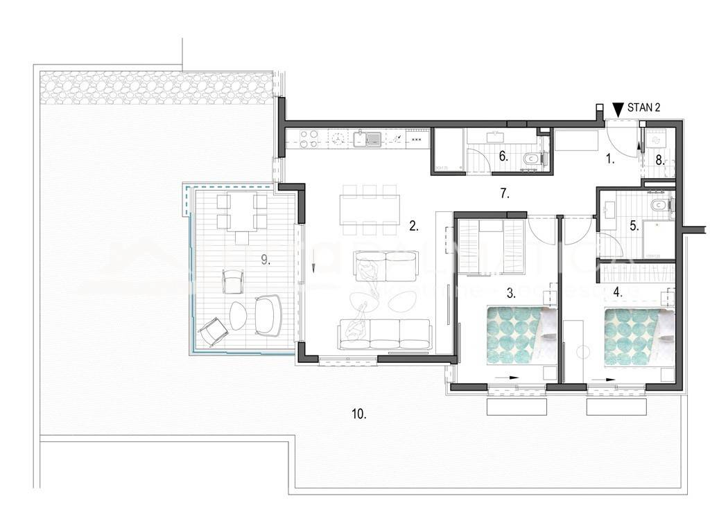 The apartment is located on the ground floor and has a total area of ​​96.76 m², of which 80.15 m² is living space. It consists of an entrance hall, kitchen, living room and dining room, two bedrooms, two bathrooms, hallway and laundry room, while additional value is provided by a 7 m² balcony and a 9.46 m² garden, ideal for outdoor relaxation. The apartment has a functional layout, bright and spacious, suitable for both living and investment in tourism. As an additional benefit, first-time buyers have the privilege of choosing a parking space in the garage or outside and a storage room , which makes this property even more attractive.