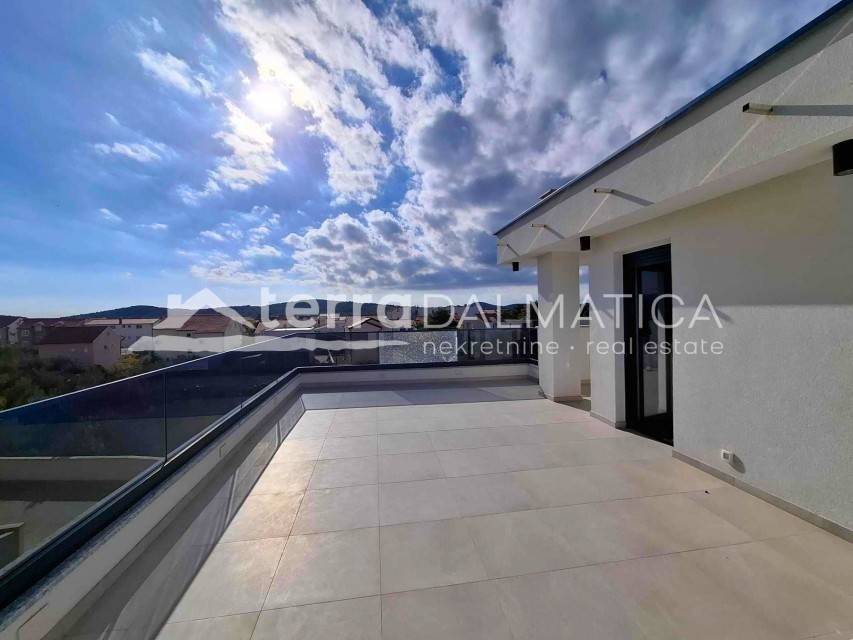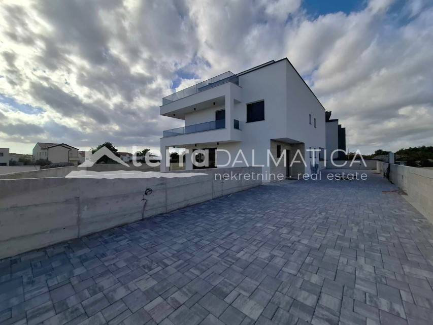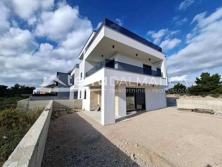 A modern, newly built semi-detached house is for sale in a quiet location in Srima, just 250 meters from the sea and 800 meters from the center. The house, with a total area of 153 m², is spread over three floors – ground floor, first floor and second floor – and was designed with special attention to functionality and comfort, ideal for year-round living or tourist rental.