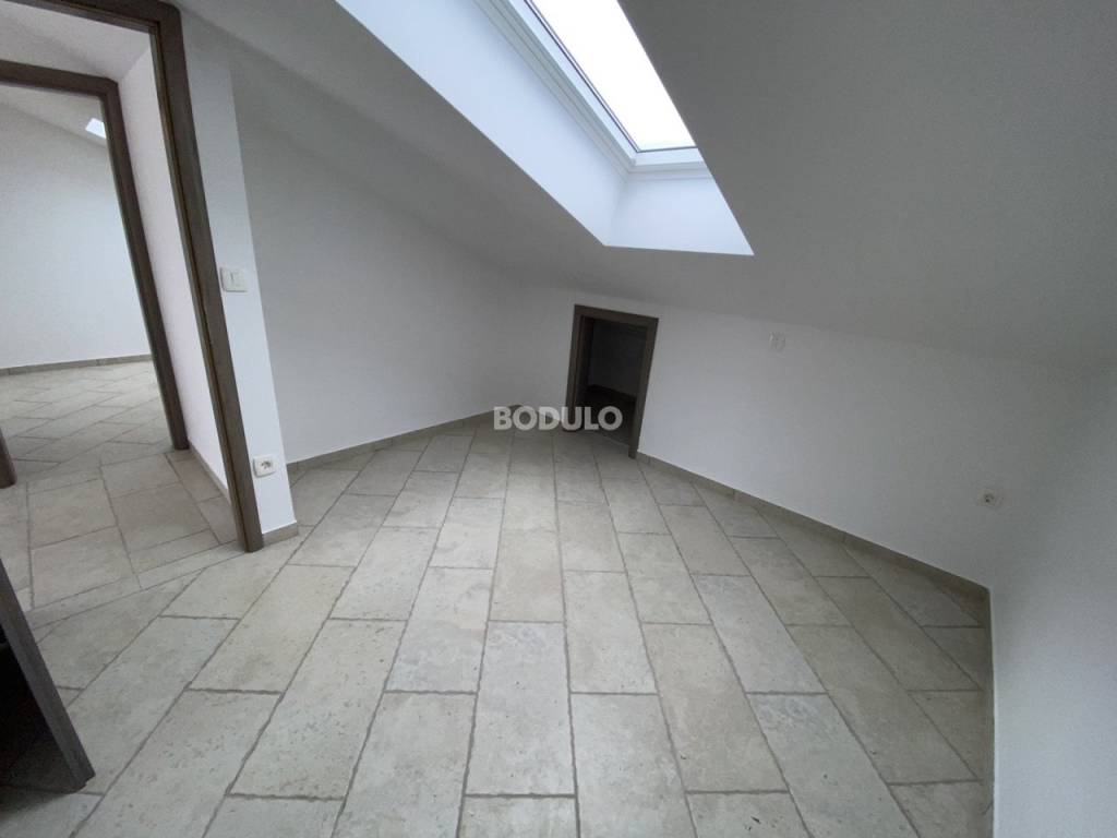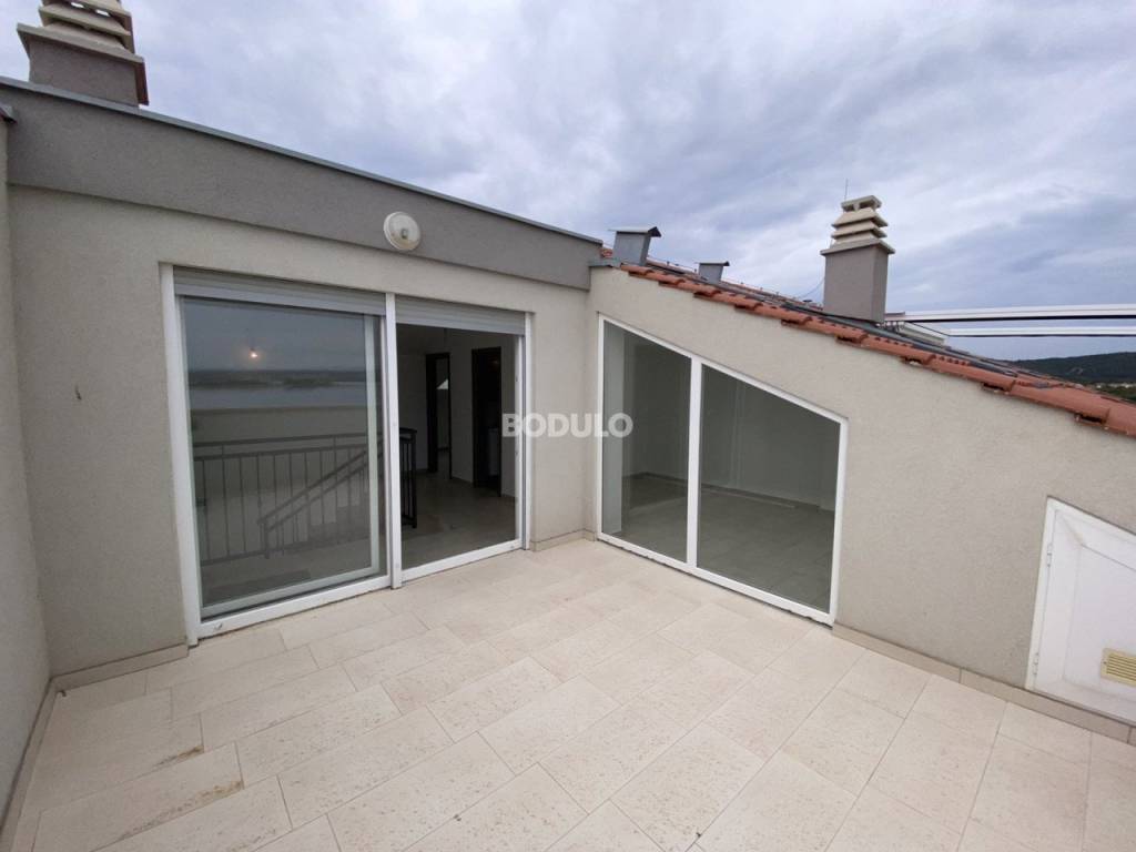 In a residential building with nine apartments located in the town of Kraj on the island of Pašman, there is still one apartment left for sale. This two-story, four-room apartment is located on the second floor of the building and in the attic. It has a total usable area of 100 m2. In the lower floor of the apartment there is a hallway, bathroom, hallway, two bedrooms, living room with kitchen and dining room and a staircase, while in the attic there is a living room, a storage room, two bedrooms with storage rooms and a bathroom. The apartment also includes balconies on the lower floor of 2.75 m2, 3.84 m2 and 4.98 m2, as well as an uncovered terrace in the attic of 13.65 m2 and one parking space. The terrace of the apartment offers a beautiful open view of the sea, and the building itself is located in an idyllic bay just 10 meters from the beautiful beach.