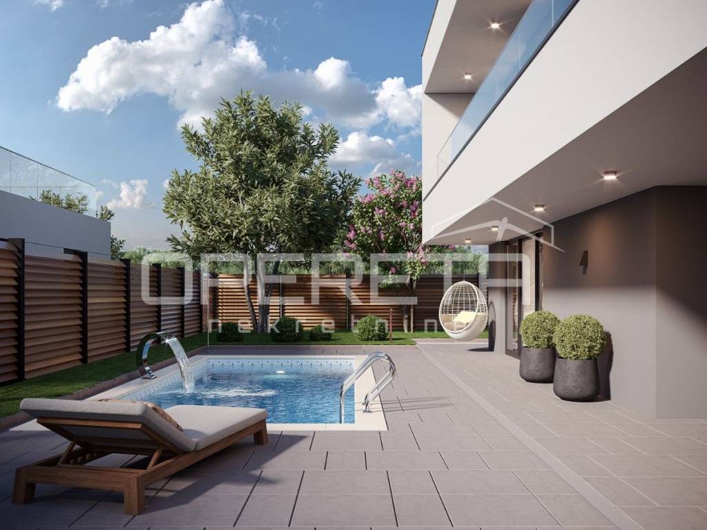 Tlocrtno, prizemlje kuće sastoji se od otvorenog dnevnog boravka s kuhinjom i blagovaonicom, jedne spavaće sobe s vlastitom kupaonicom, gostinjskog toaleta te dvije natkrivene terase, od kojih jedna ima površinu veću od 37 m. U sklopu dvorišta predviđen je i pomoćni objekt koji može služiti kao spremište ili ljetna kuhinja. Na katu su smještene dvije prostrane spavaće sobe, kupaonice, natkrivena lođa i terasa ukupne površine preko 25 m.