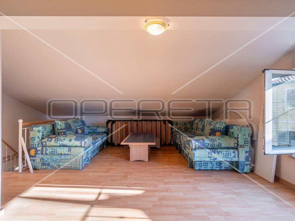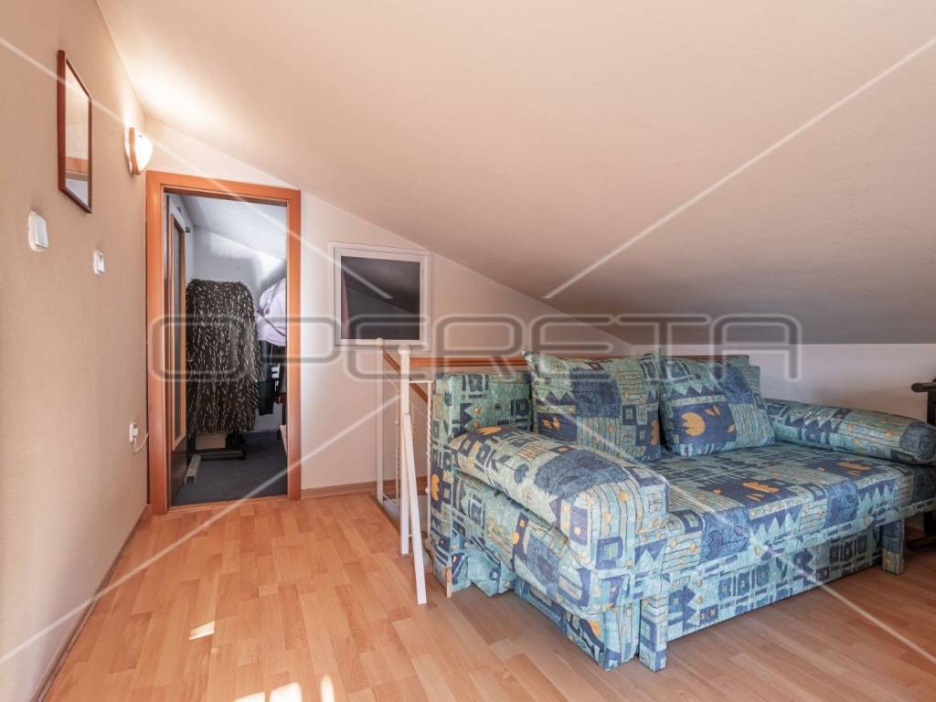 The apartment covers 104 m2 of living space and consists of an entrance hall, a living room with access to a closed loggia, a kitchen that is slightly separated from the living room, providing additional functionality, bathrooms and storage rooms, two spacious bedrooms, one of which it has an exit to another loggia. The spacious gallery on the second floor is suitable for a bedroom with a wardrobe or a study. The apartment has an additional storage room in the basement of the building and one parking space in front of the building.
