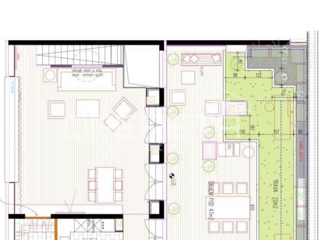 Stan čini 141 m2 unutarnje stambene površine te velika natkrivena terasa od 27 m2 s prostranim vrtom od 70m2.