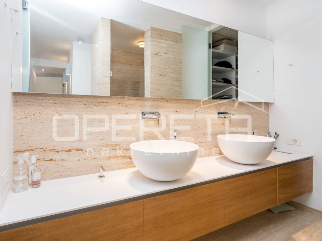 Obilježje cijelog stana je raskošni kamen travertin koji se proteže od ulaznog prostora, kroz sve kupaonice, stepenište i kuhinju.