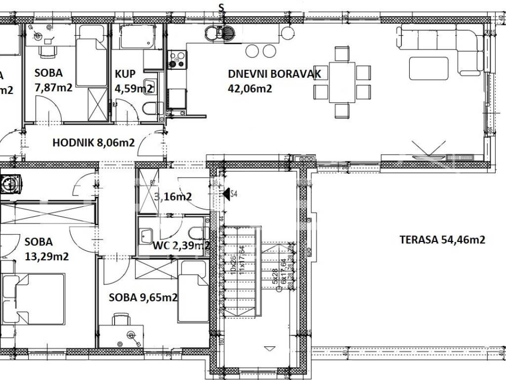 S4 Prodaje se 5 soban PENTHOUSE u novogradnji na 2. katu urbane vile sa samo 4 stana. Sami stan ima 102,71m2 bez terase i balkona. Sastoji se od "open space" dnevnog boravka s blagovaonicom i kuhinjom, četiri sobe, kupaonice s wc-om, odvojenog wc-a, ulaznog dijela i balkona na koji se izlazi iz spavaće sobe i terase od 54m2 na koju se izlazi iz dnevnog boravka.