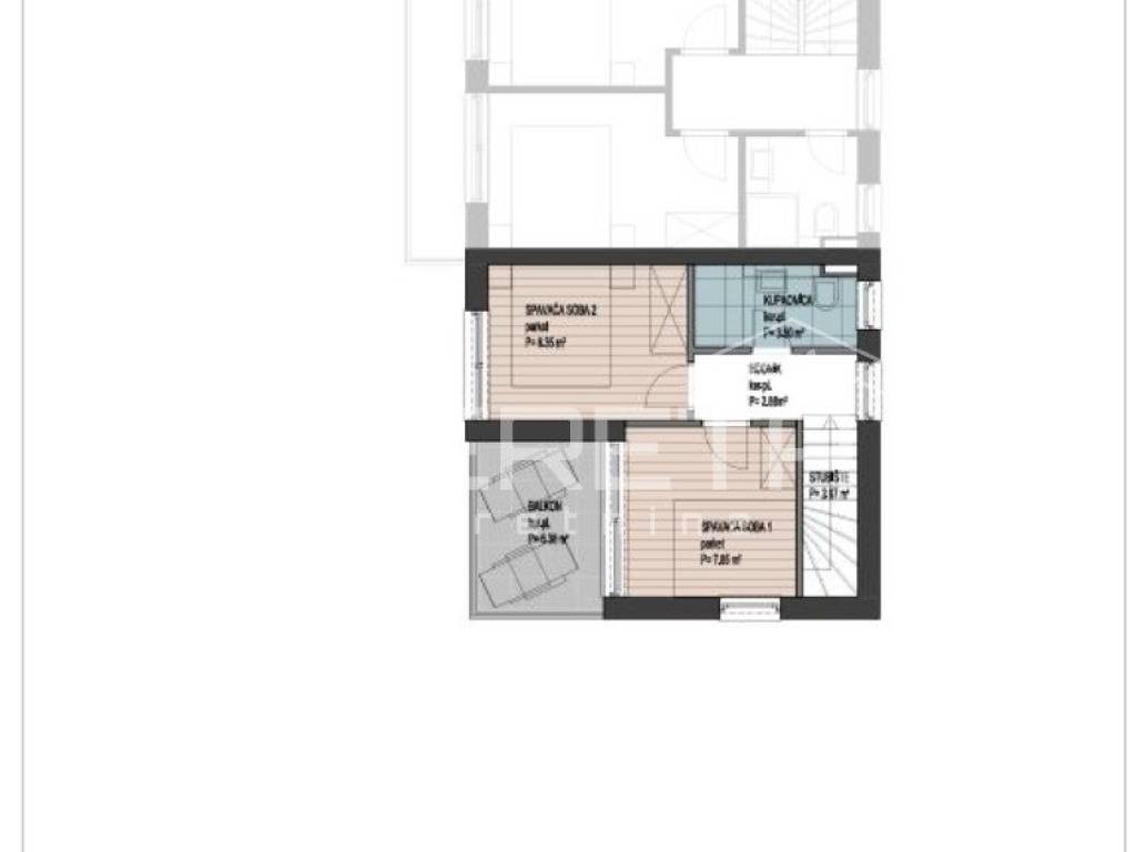 2 piano: 2 camere da letto, corridoio, bagno, scala e balcone 6,38 m (coeff. 0,50)