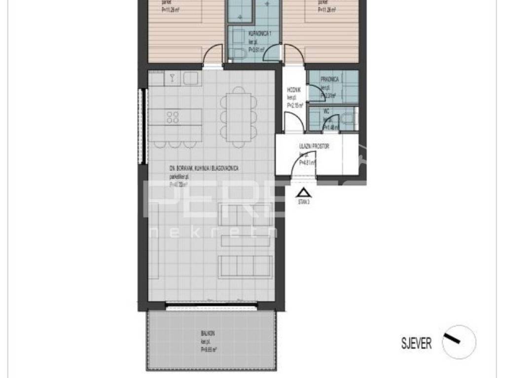 Apartment S3D, located on the 2nd floor, offers 80,62 m of living space with a carefully planned layout: hallway, laundry room, WC, two bathrooms, spacious living and dining area, kitchen, two bedrooms, and a balcony of 9,66 m (coefficient 0.50).