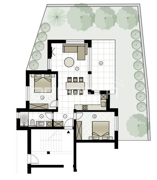 The bright, airy and functional floor plan consists of an "open space" spacious living room with a kitchen and dining room and exit to the terrace, 2 bedrooms, a bathroom with a toilet and a hallway, and it also includes 2 outdoor parking spaces and a yard/garden BRP 85 m2.