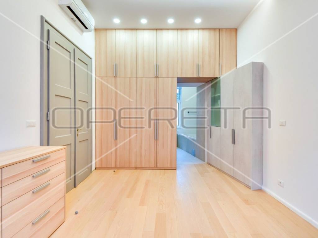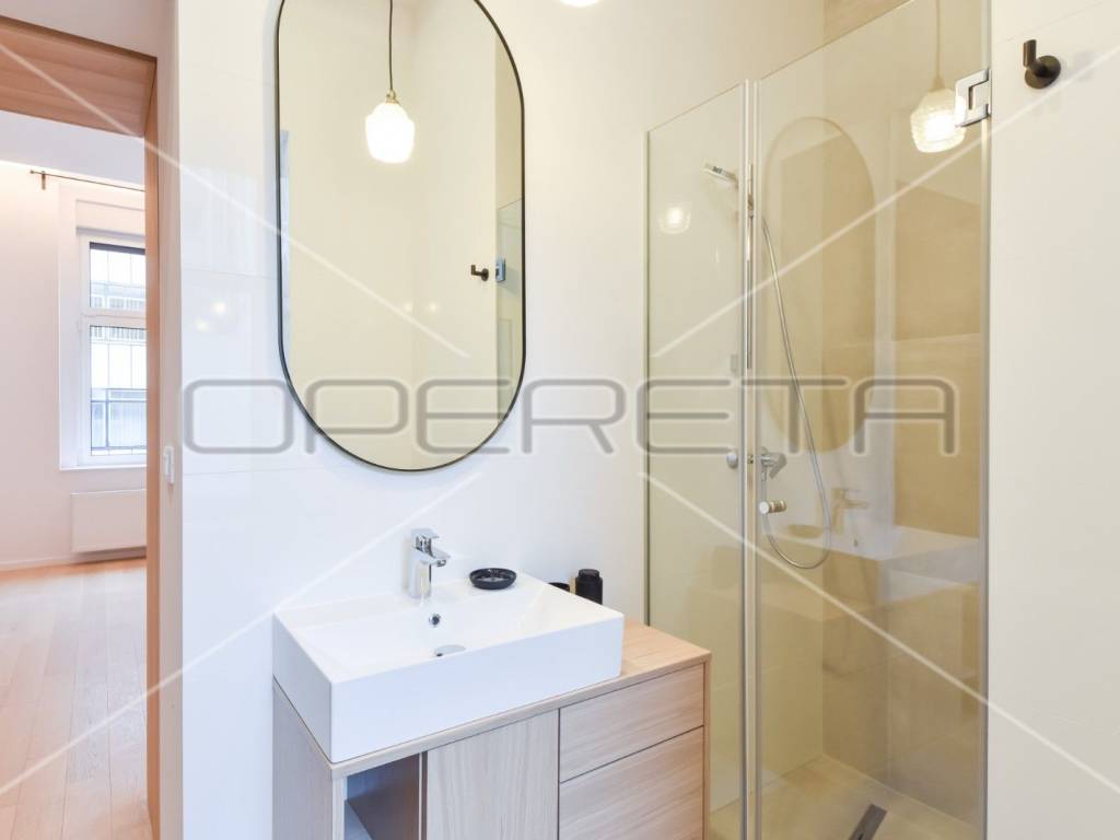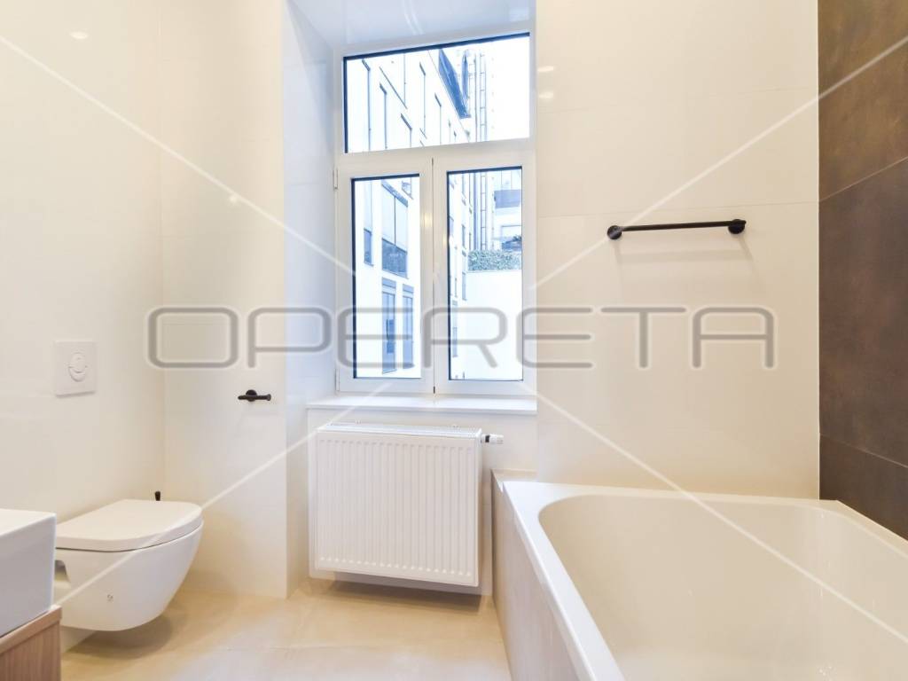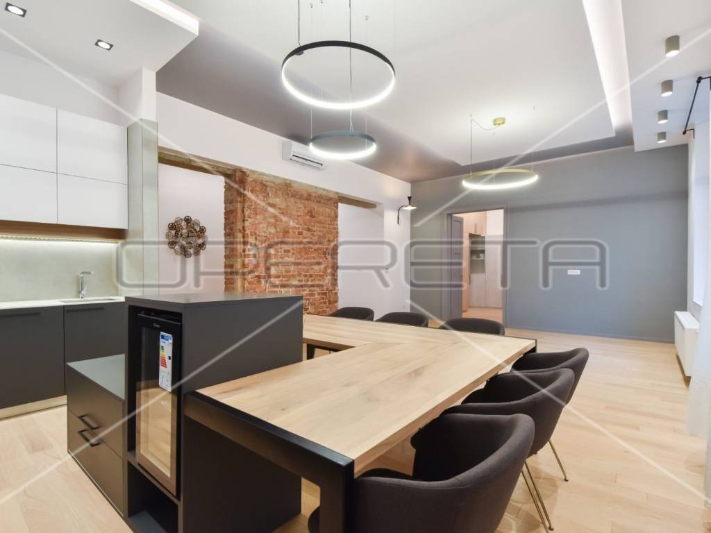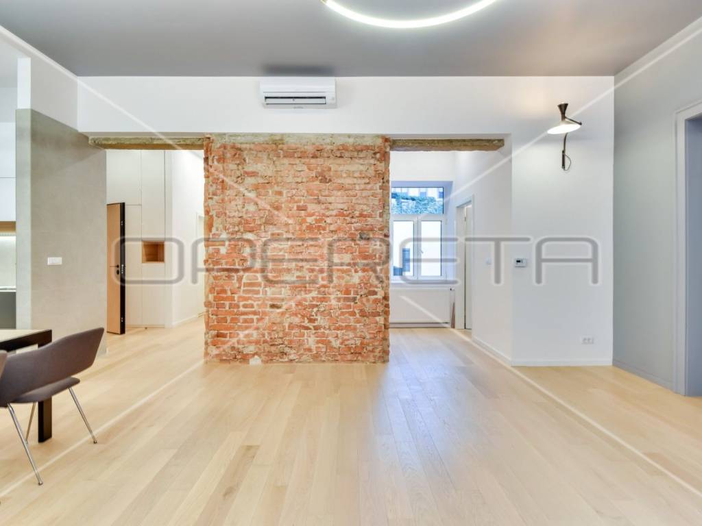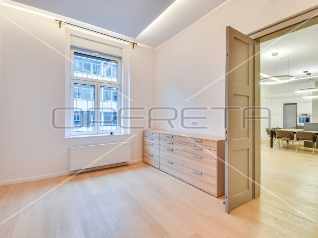 Newly renovated, exclusive apartment near Cvjetni trg in a renovated building with an elevator. The apartment consists of an entrance hall with built-in wardrobes, a spacious living room (open space) with dining room and kitchen, master bedroom with private bathroom and balcony, guest toilet, utility room with dryer and washing machine, bedroom or study depending on need which also has its own bathroom and storage room. Bright and cozy apartment in the center, completely newly renovated and equipped.