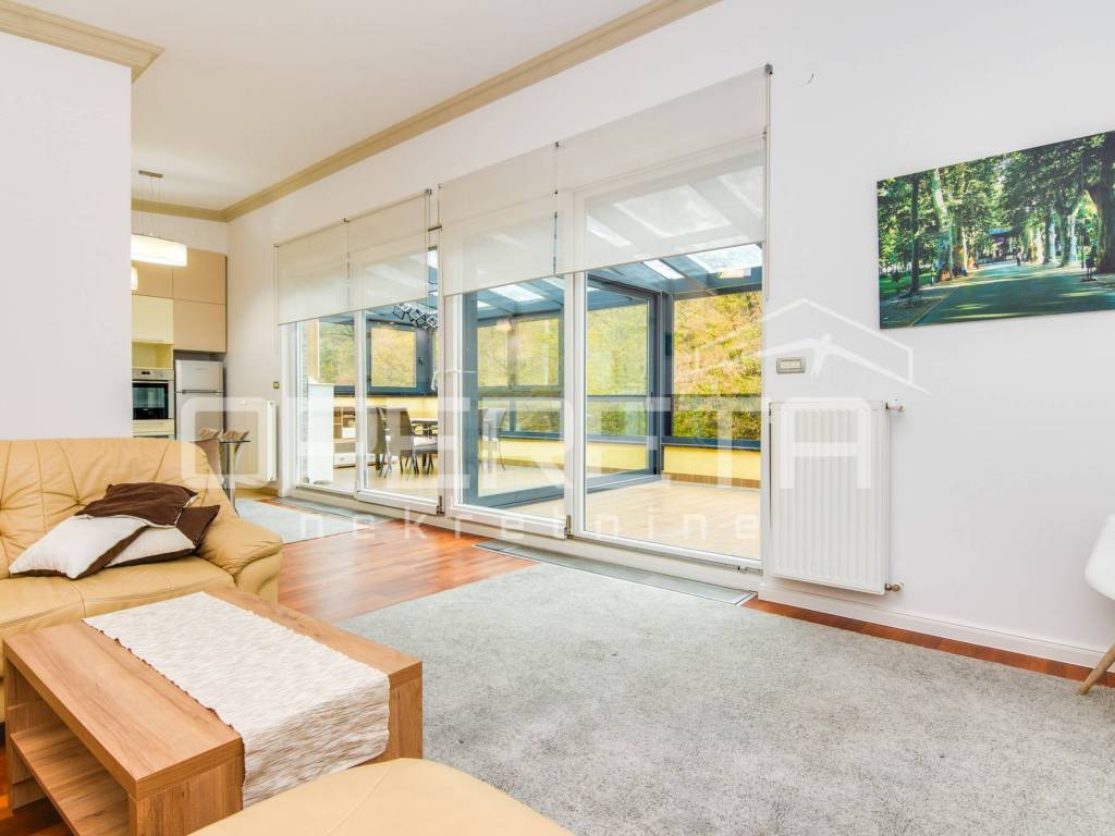 Rent of the aparment, Vinogradska, Jelenovački potok, penthouse, a beautiful twobedroom apartment in a villa with a large terrace. Sam indoor living space has 100m2 + terrace of 52m2. Look at the forest park Jelenovac, peace and greenery. The apartment also has a garage and parking space. Villa is equipped with elevator and sports cabinet with unlimited possibility to use audio and video surveillance and ample parking. Located in a green zone, three tram stops from the square Ban Josip Jelacic and seven minutes walk to the SQUARE DR. Franjo Tudjman.