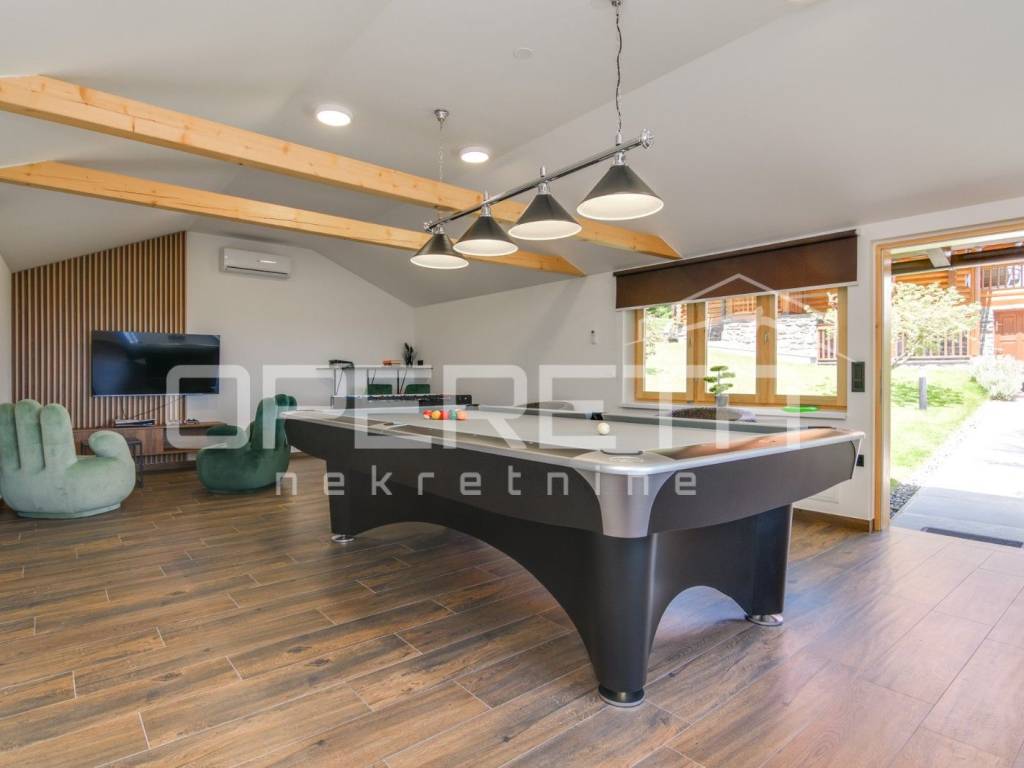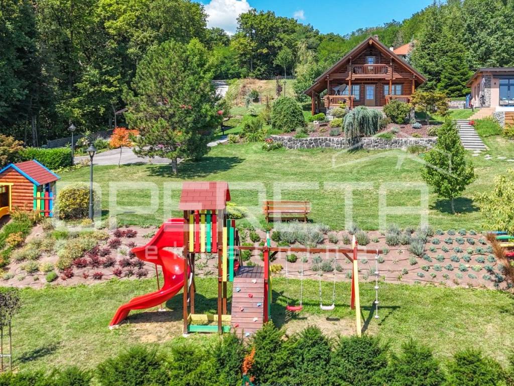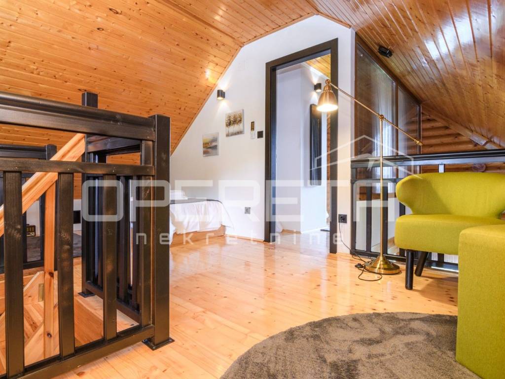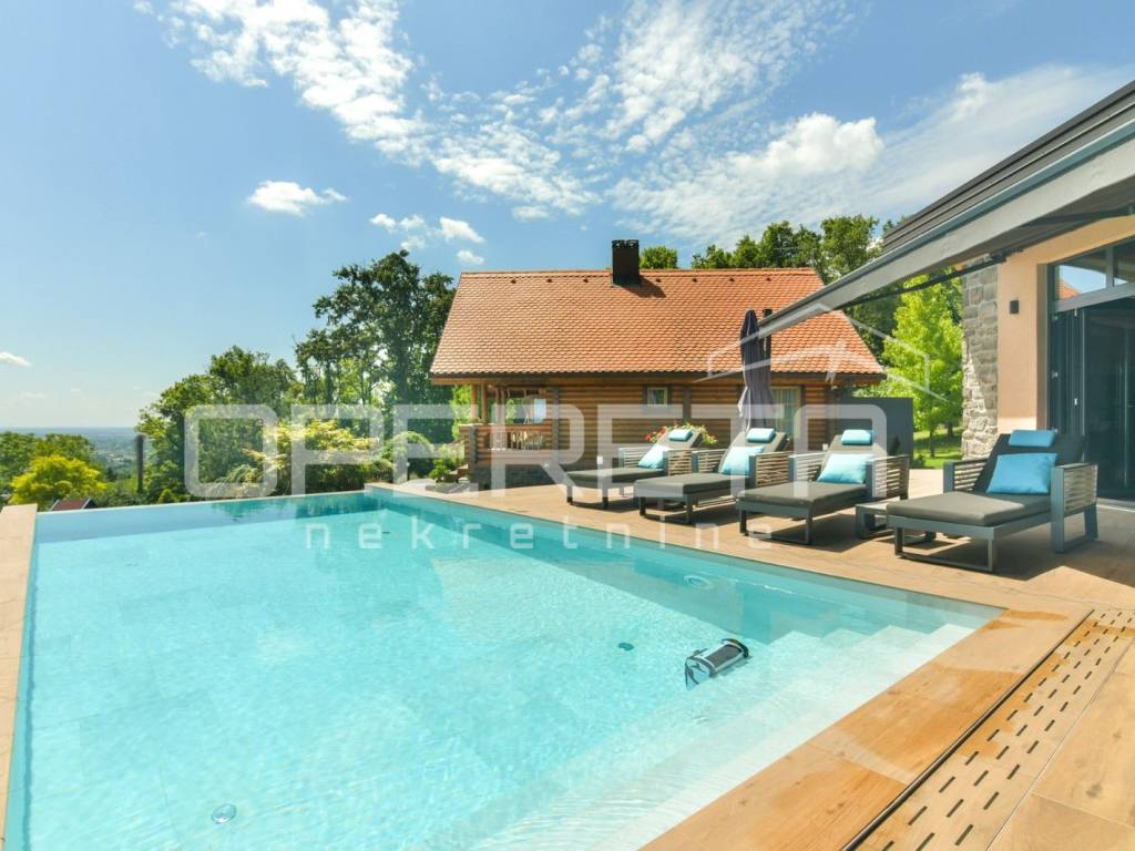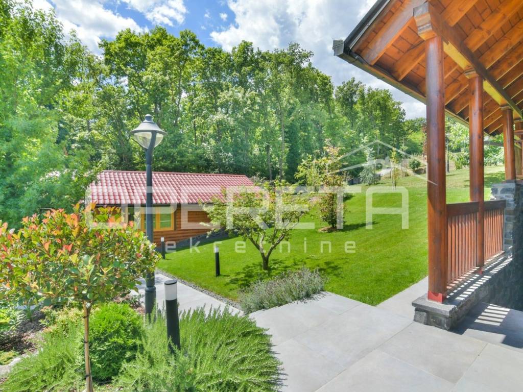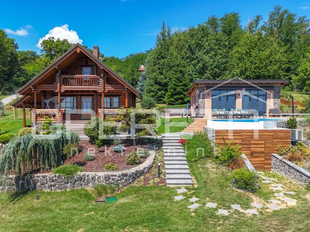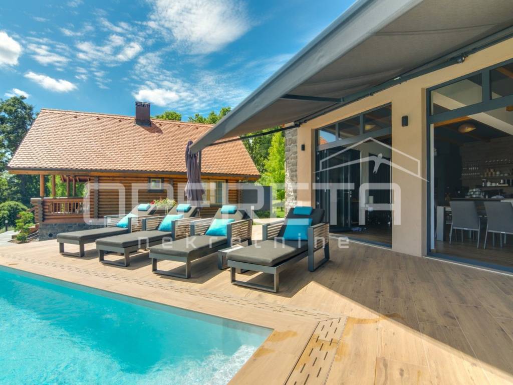 Kuća s bazenom, Sveti Ivan Zelina, Donje Orešje Prodaje se kuća za odmor s bazenom u mirnom okruženju prirode i šume, s otvorenim pogledom na okolicu. Kuća (150m2) se sastoji od podruma gdje je smješten mini wellness s jaccuzijem i saunom te prostorom za odmor, kupaonicom i čajnom kuhinjom. Visoko prizemlje se sastoji od kuhinje s dnevnim boravkom i blagovaonicom, spavaće sobe i kupaonice. U potkrovlju su smještene dvije spavaće sobe. Na parceli se nalazi i pomoćna zgrada sa sadržajem za zabavu i odmor te grijani bazen s prostorom za proslave i druženje.