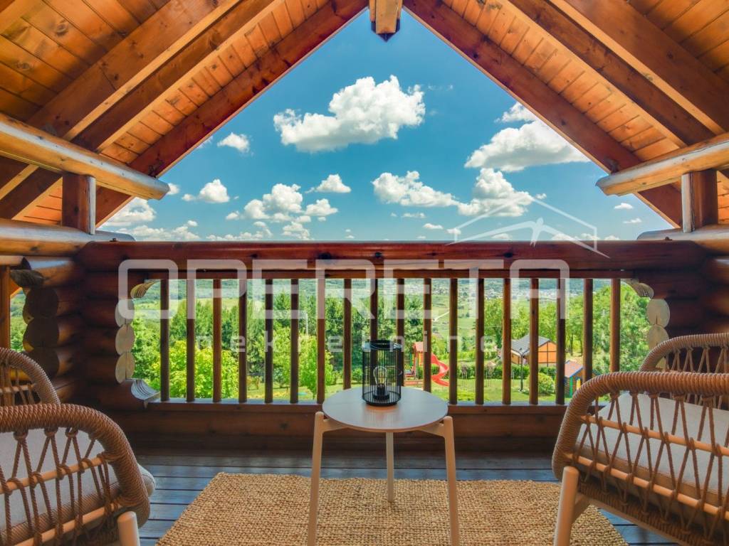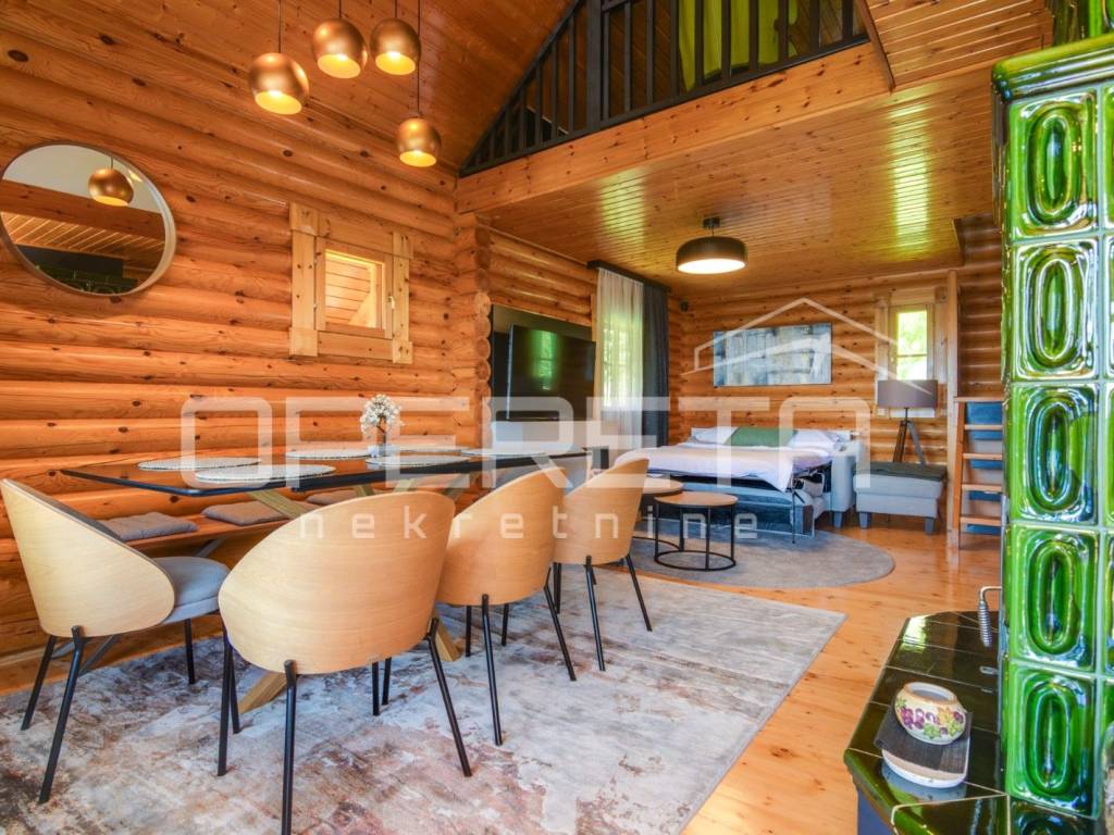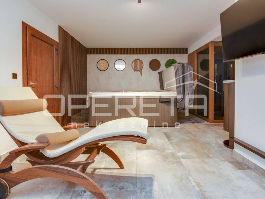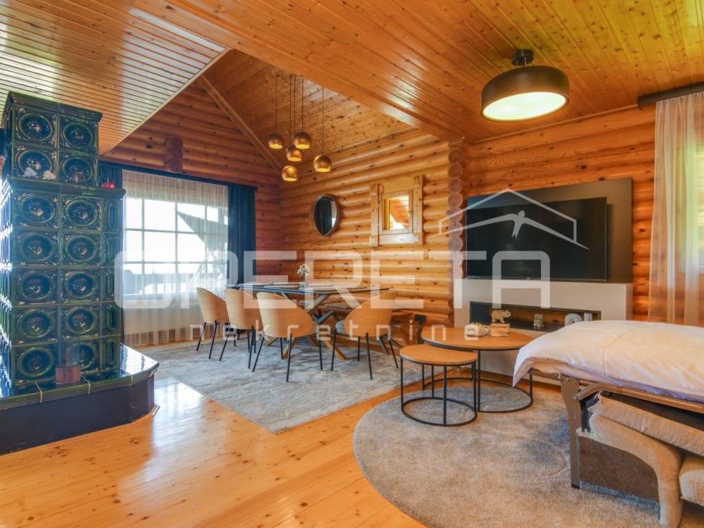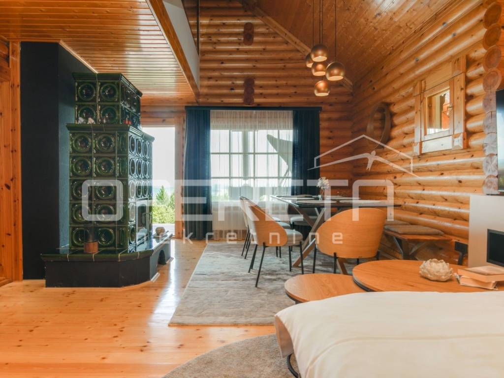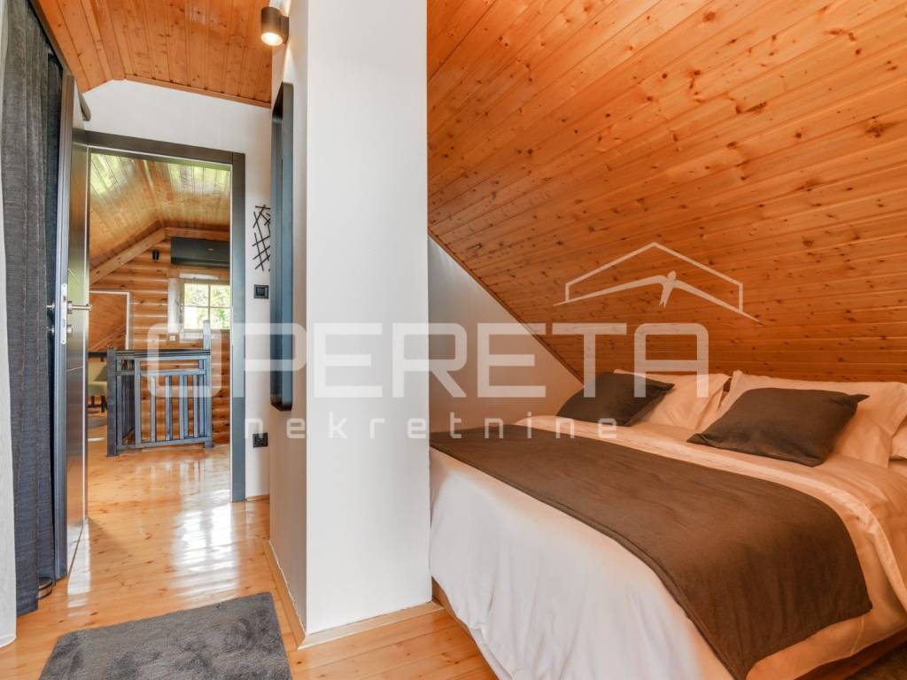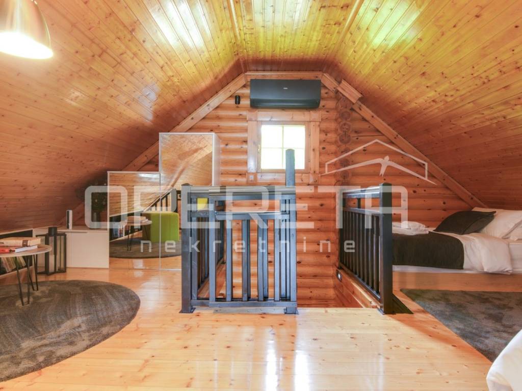 Kuća s bazenom, Sveti Ivan Zelina, Donje Orešje Prodaje se kuća za odmor s bazenom u mirnom okruženju prirode i šume, s otvorenim pogledom na okolicu. Kuća (150m2) se sastoji od podruma gdje je smješten mini wellness s jaccuzijem i saunom te prostorom za odmor, kupaonicom i čajnom kuhinjom. Visoko prizemlje se sastoji od kuhinje s dnevnim boravkom i blagovaonicom, spavaće sobe i kupaonice. U potkrovlju su smještene dvije spavaće sobe. Na parceli se nalazi i pomoćna zgrada sa sadržajem za zabavu i odmor te grijani bazen s prostorom za proslave i druženje.