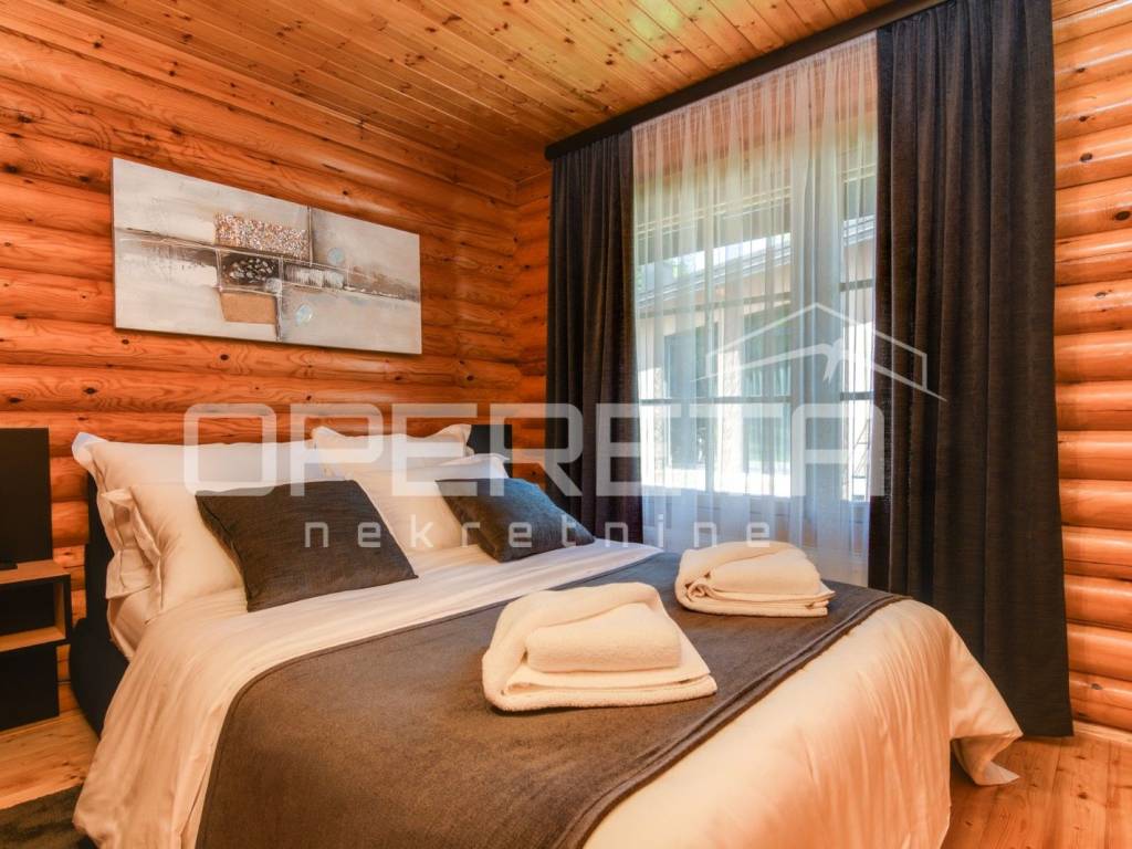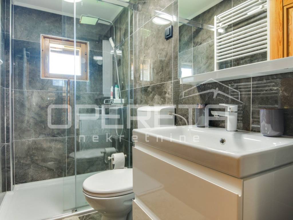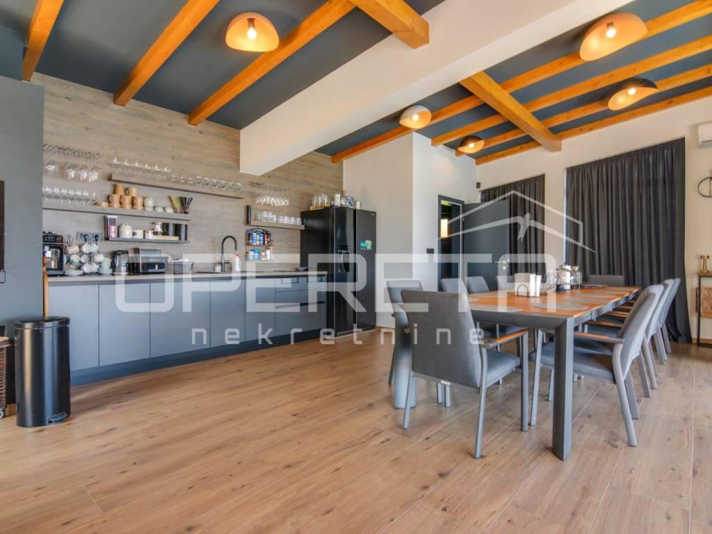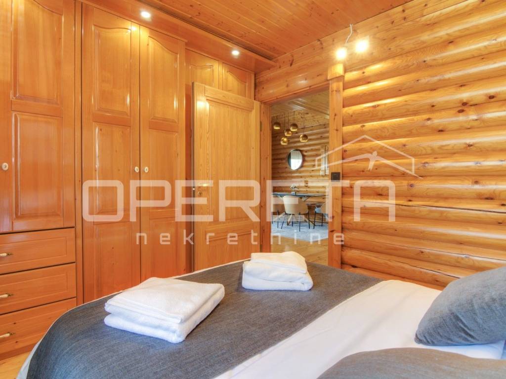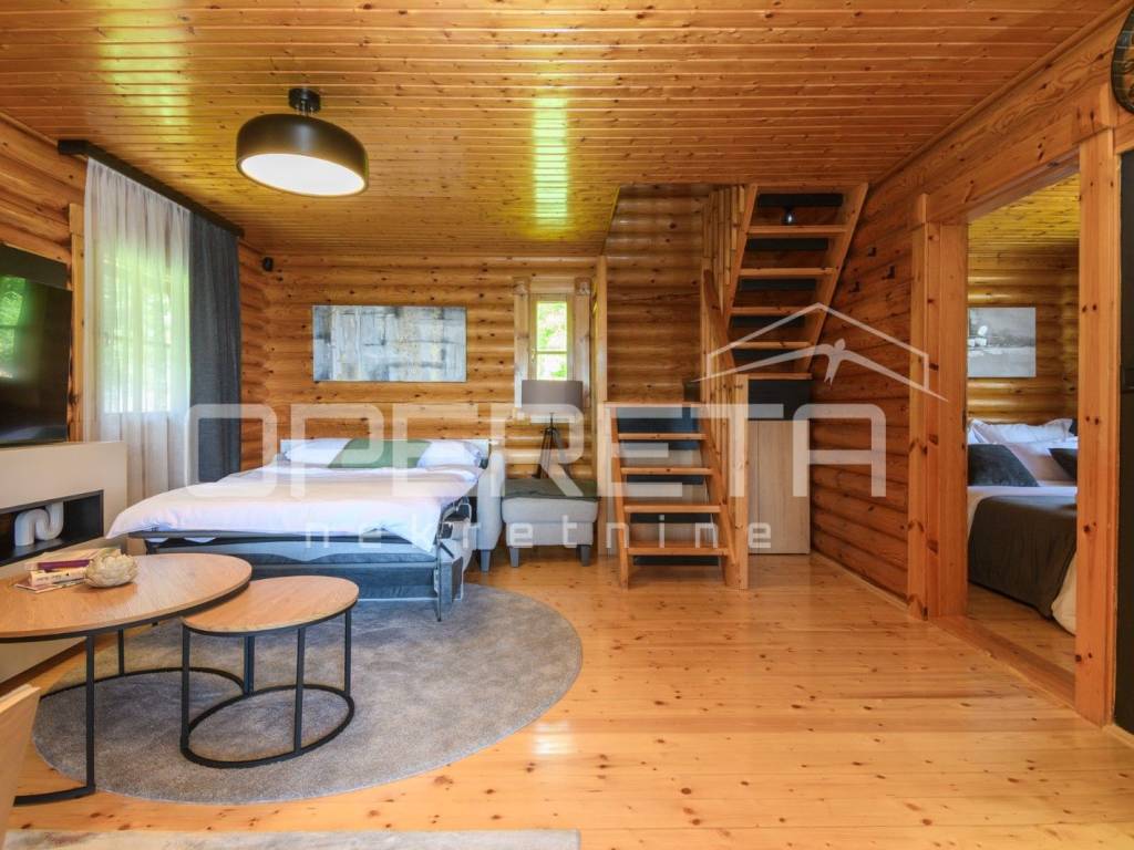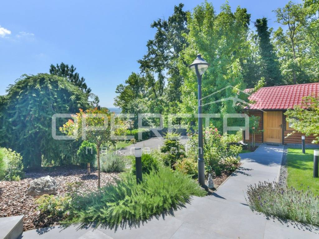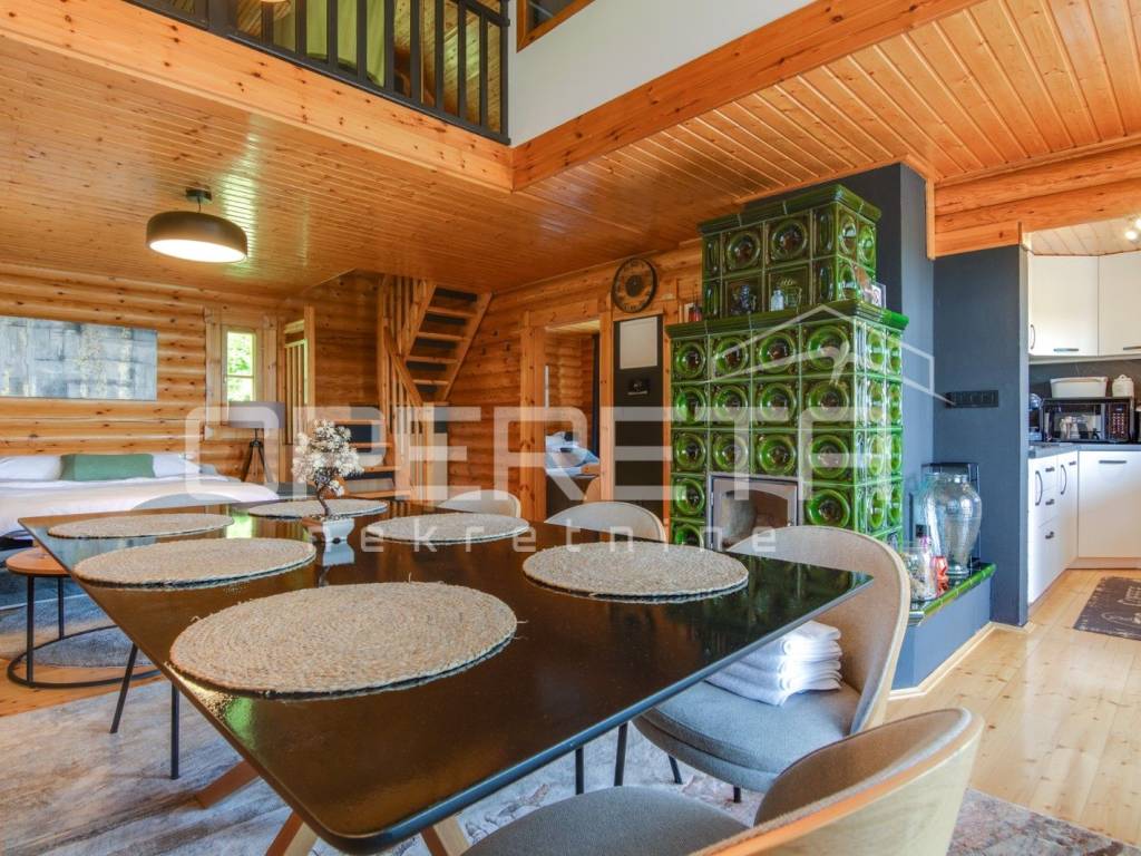 Kuća s bazenom, Sveti Ivan Zelina, Donje Orešje Prodaje se kuća za odmor s bazenom u mirnom okruženju prirode i šume, s otvorenim pogledom na okolicu. Kuća (150m2) se sastoji od podruma gdje je smješten mini wellness s jaccuzijem i saunom te prostorom za odmor, kupaonicom i čajnom kuhinjom. Visoko prizemlje se sastoji od kuhinje s dnevnim boravkom i blagovaonicom, spavaće sobe i kupaonice. U potkrovlju su smještene dvije spavaće sobe. Na parceli se nalazi i pomoćna zgrada sa sadržajem za zabavu i odmor te grijani bazen s prostorom za proslave i druženje.