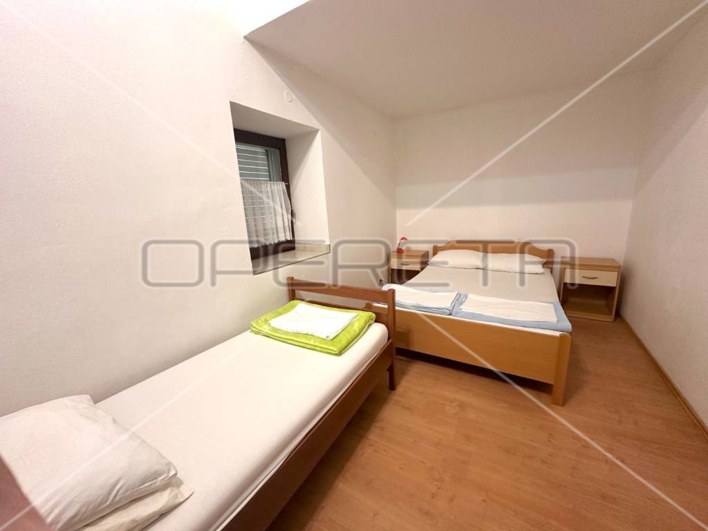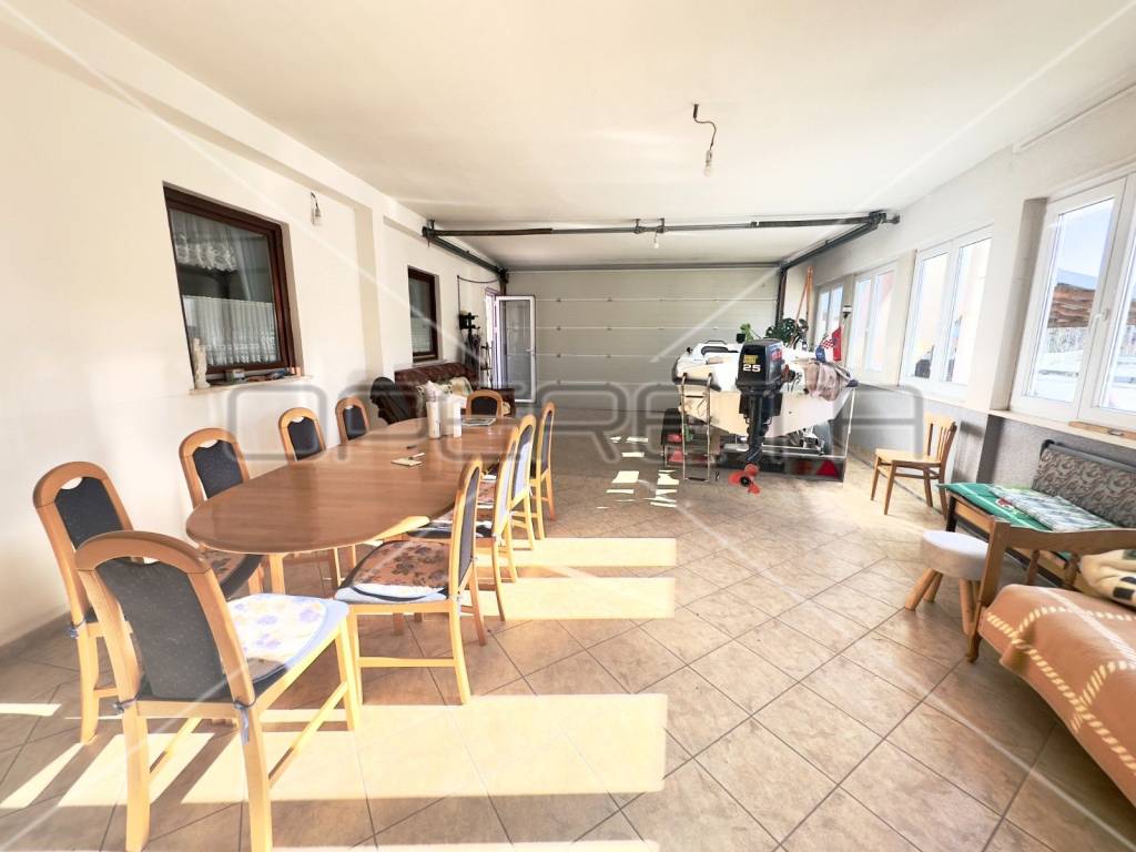 On the ground floor there is a spacious room for socializing as well as two garages that provide not only practicality for parking vehicles but also additional storage space, and there is also a toilet. Also, on the ground floor there is an apartment consisting of a spacious kitchen with a dining room, two bedrooms, a bathroom and a utility room.