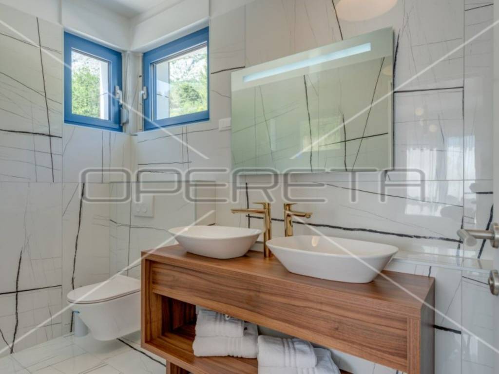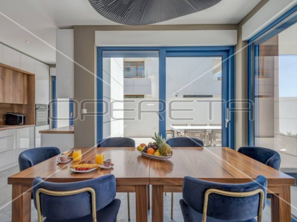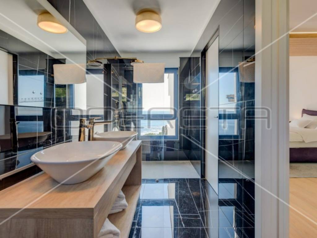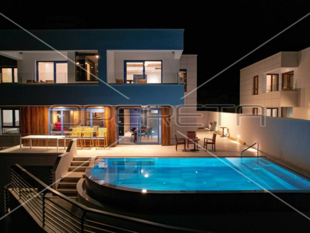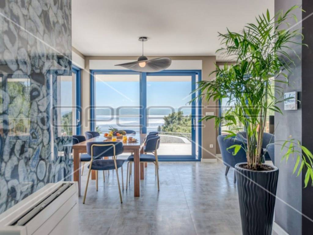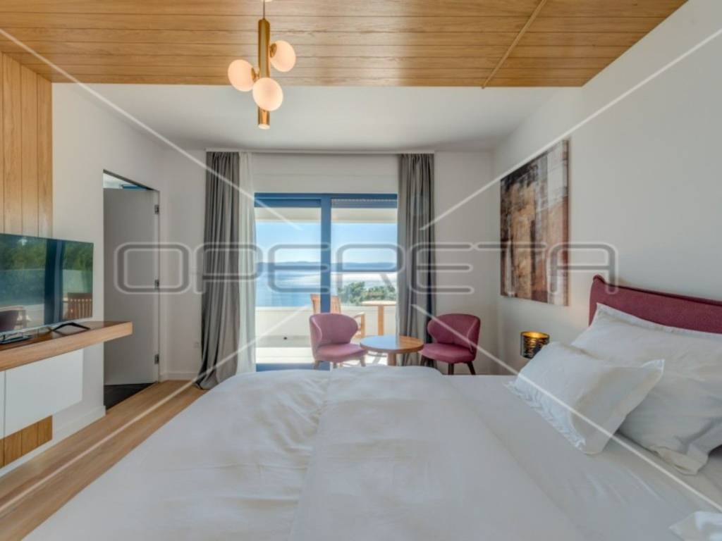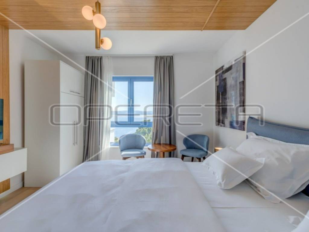 The modern and fully equipped kitchen of this luxury villa and the spacious, bright, and comfortable living room with an open view of the crystal-clear Adriatic Sea are located on the ground floor. By stepping out onto the pool terrace, you can enjoy the infinity pool with a view of the sea and islands, surrounded by eight sun loungers and other garden furniture. The outdoor grill with a large table and chairs is perfect for enjoying meals outdoors in the fresh air.