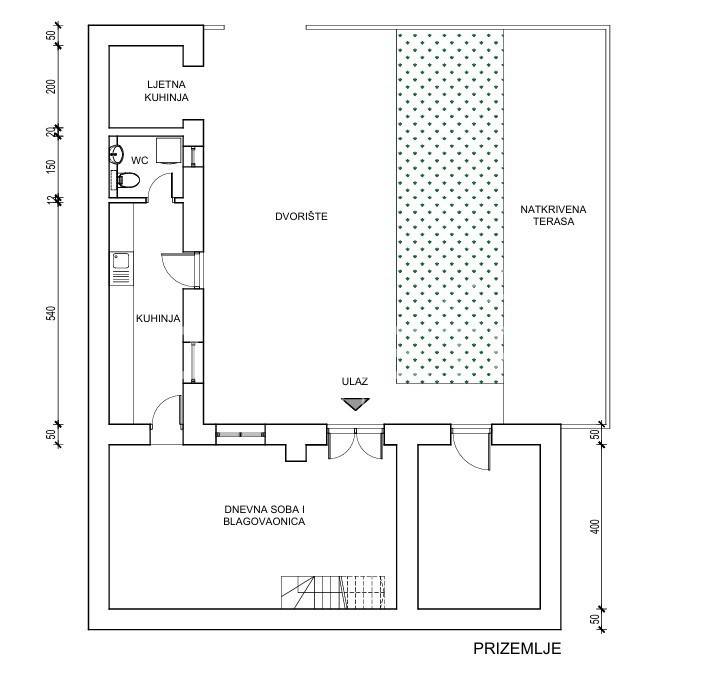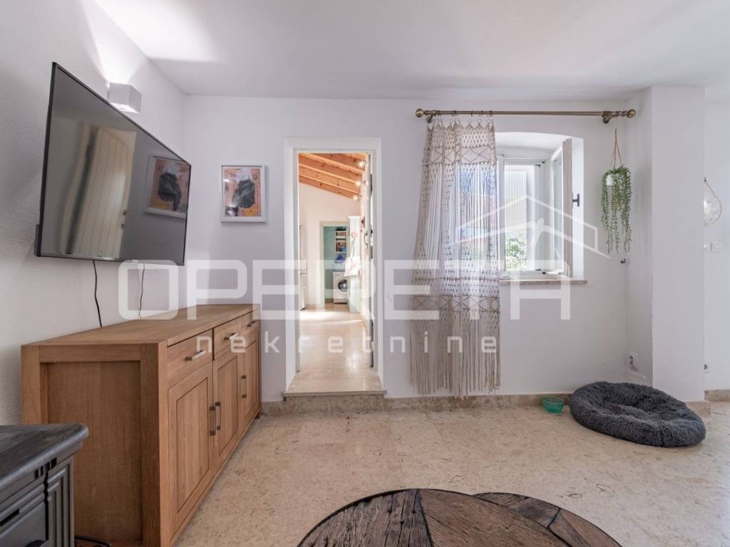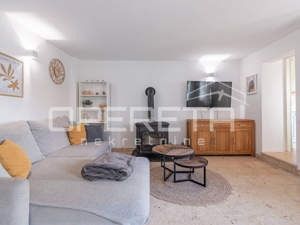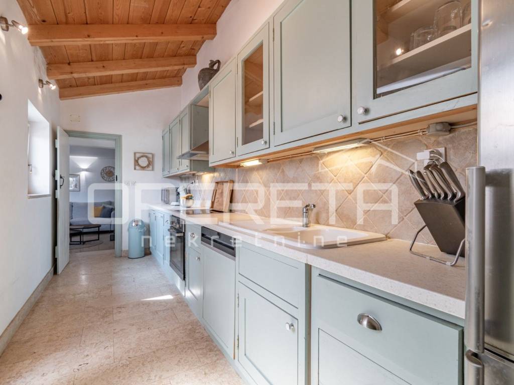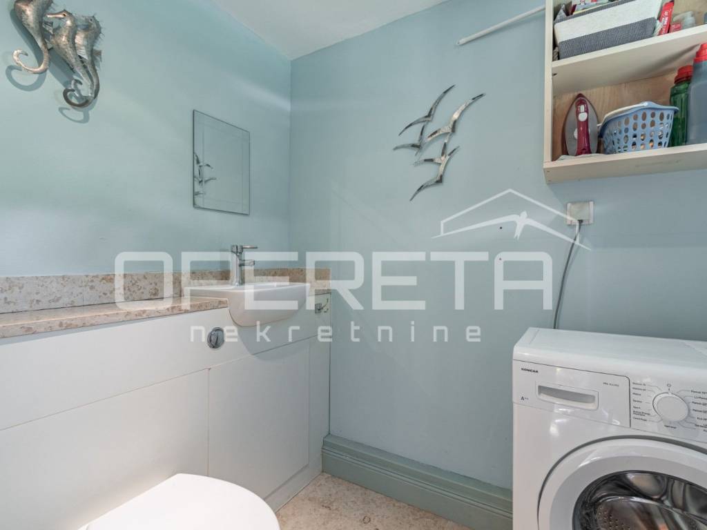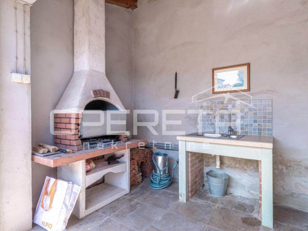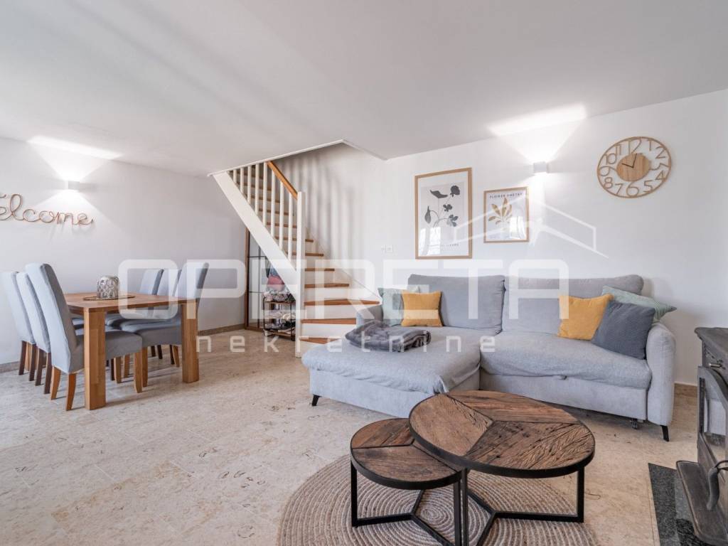 In a quiet village in the vicinity of Poreč, this beautiful stone house with an area of 157 m is located. It is spread over three floors: ground floor, first floor, and attic. The ground floor features a spacious open-plan concept with a kitchen, dining room, and living room, as well as a practical guest toilet with a laundry area.