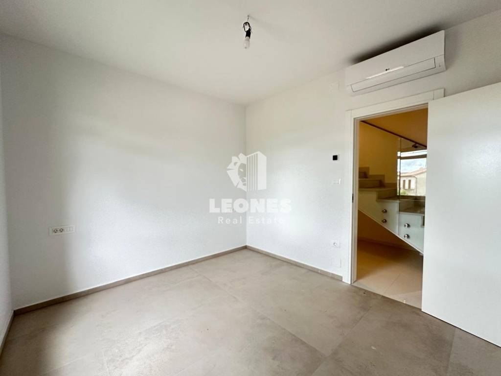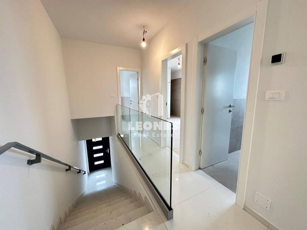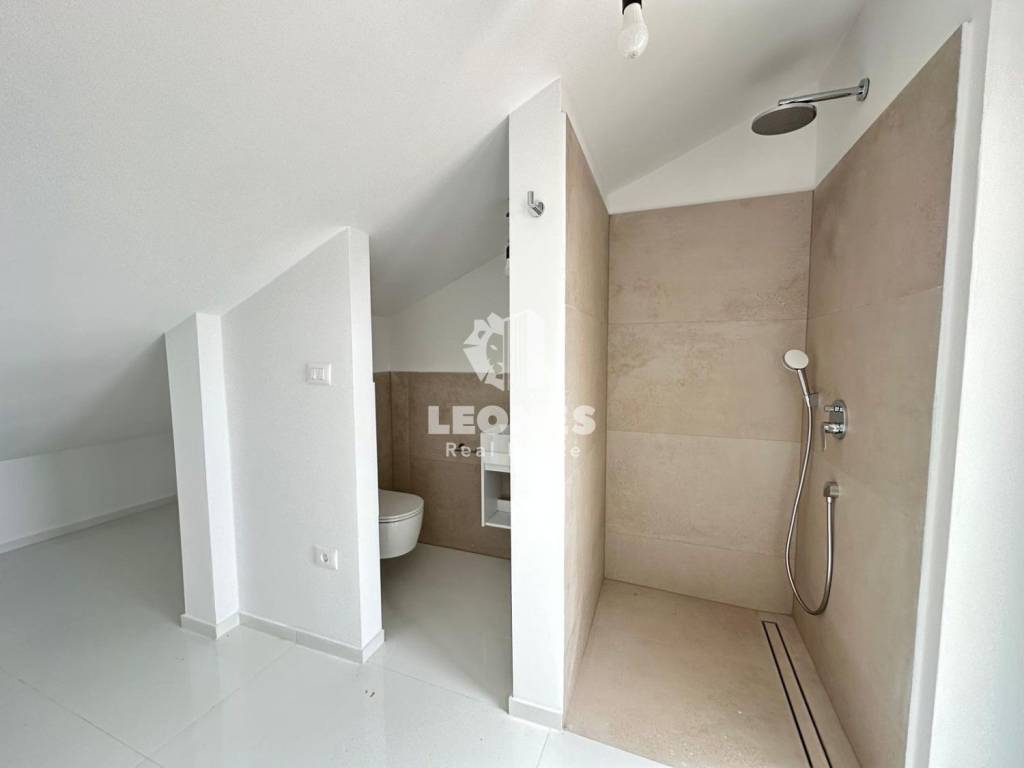 The apartment is located in a smaller building of only four residential units. The apartment has an area of 120 m2 and is spread over two floors. From the ground floor, stairs lead to the first floor, which consists of a living room and kitchen, two bedrooms, two bathrooms and a terrace with a sea view.