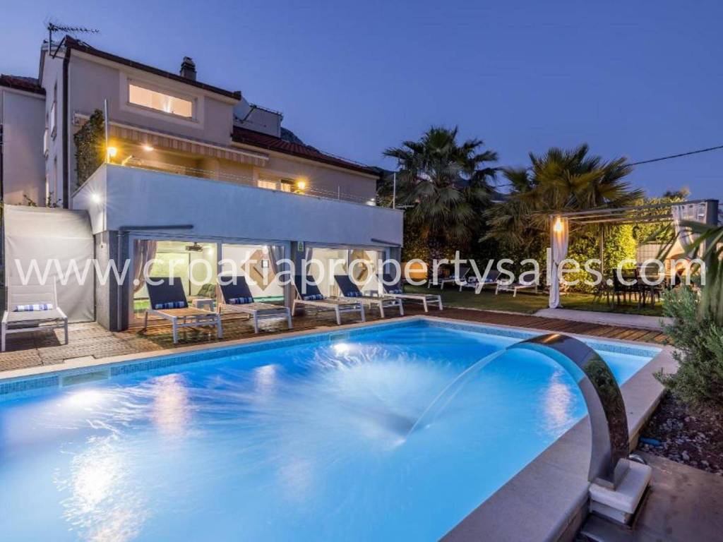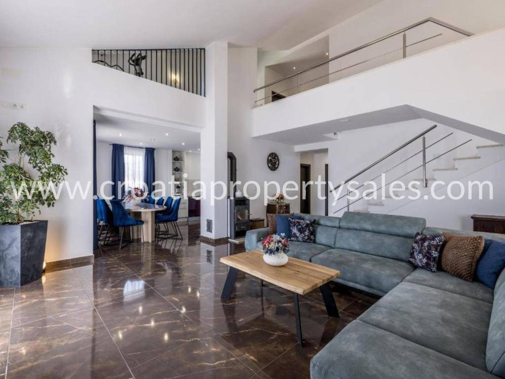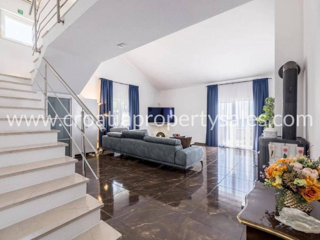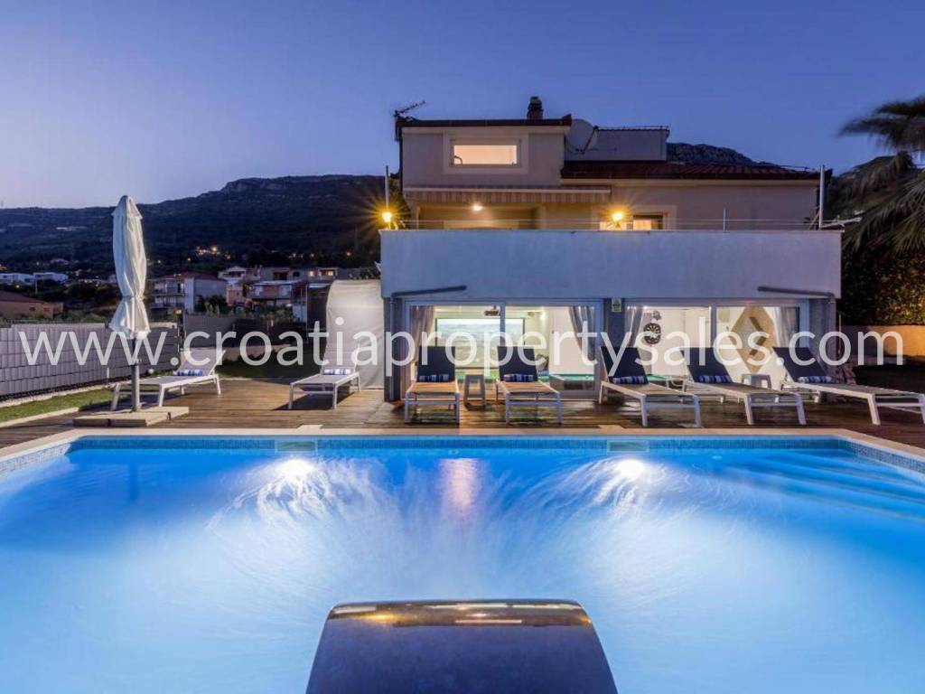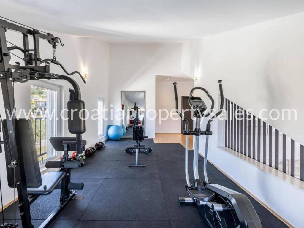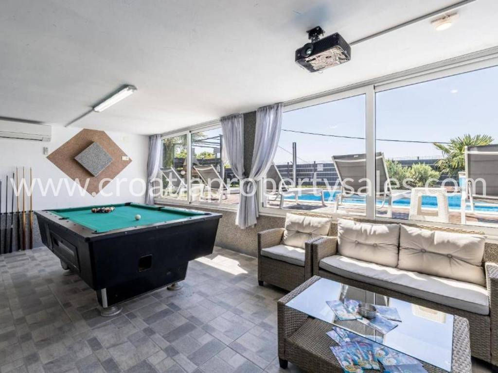 Villa with a swimming pool overlooking the sea and the Kaštela Bay. It is located on a plot of 800 m2 and has a beautifully arranged 386 m2 of living space on three levels. On the ground floor there is a swimming pool with a garden, a seating area and a barbecue.There is also a games room, an outdoor toilet and a cinema room with billiards. On the first floor there is a large living room with access to a terrace with a beautiful view of the sea and nature.The kitchen with the dining room is separated by a partition wall. On the ground floor on the north side there is one bedroom, a bathroom and a room leading to the garage and basement. Internal stairs lead to the gallery and the upper floor where there are 3 bedrooms, a bathroom on the north and a gym area on the south. On the north side of the courtyard it is possible to park 5 cars. The entire villa is fenced and offers privacy. It is located only 2 km from the center of a small beautiful town.