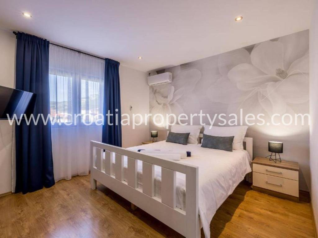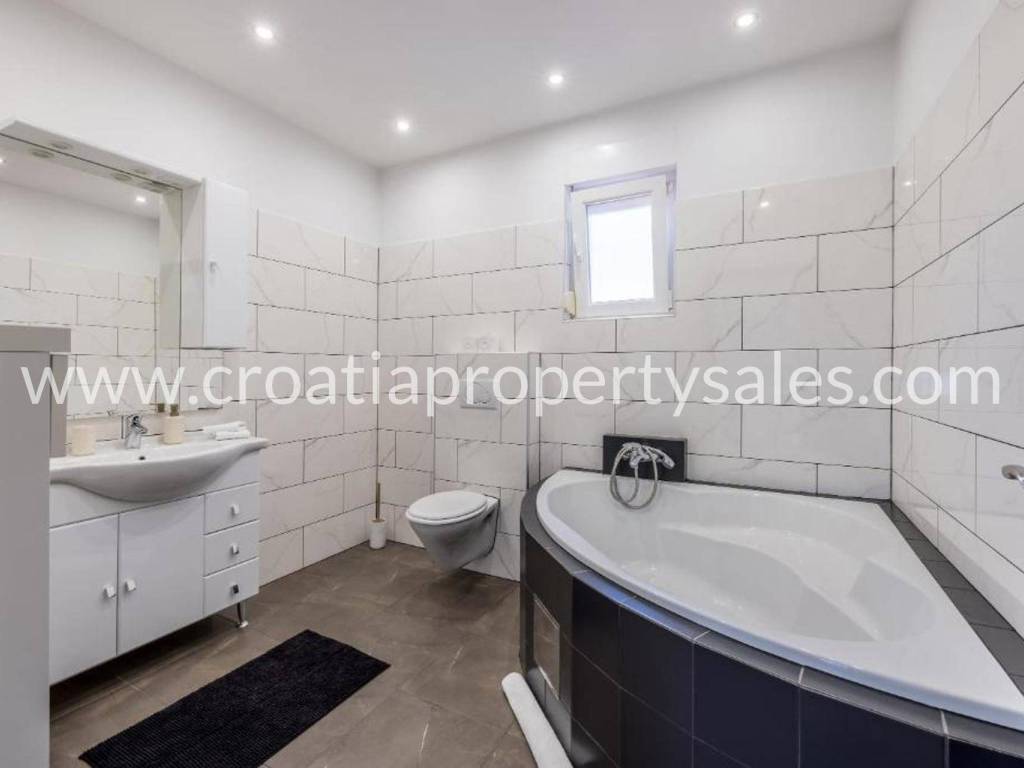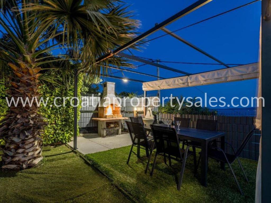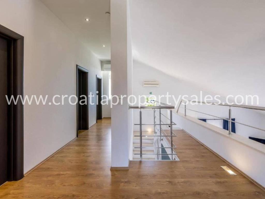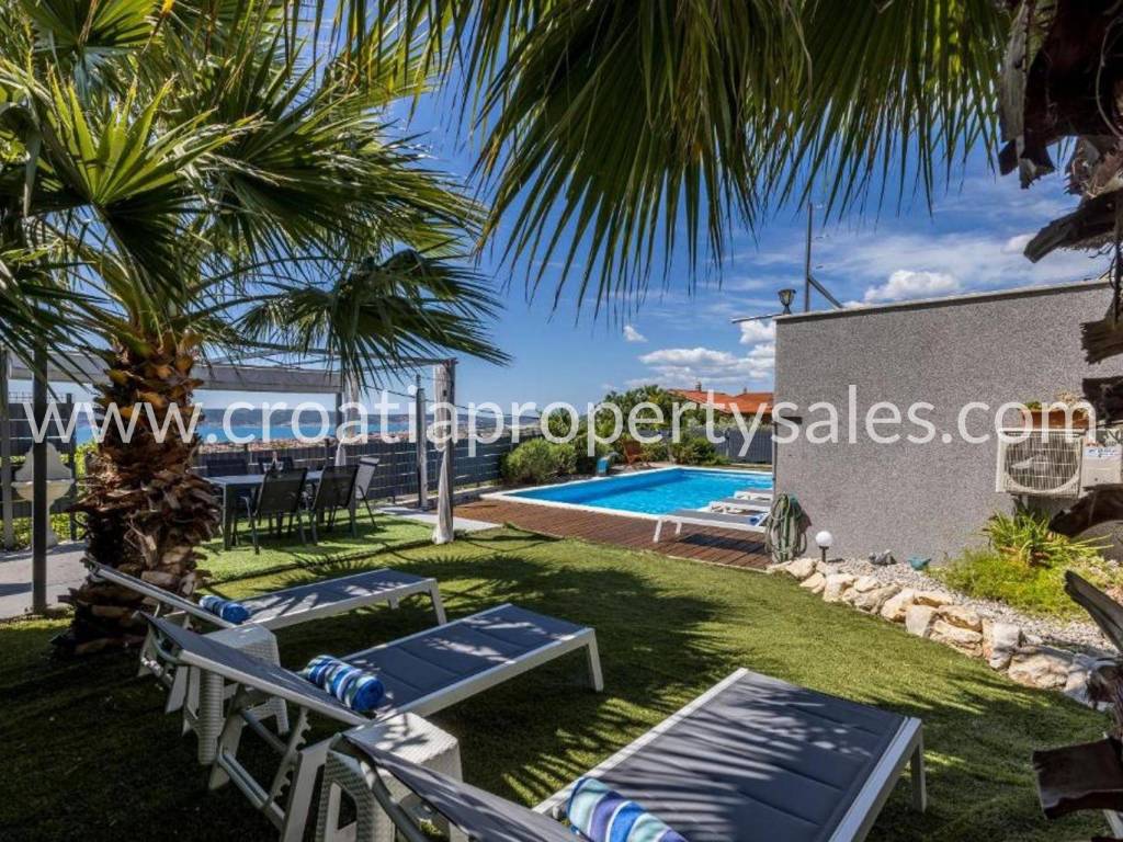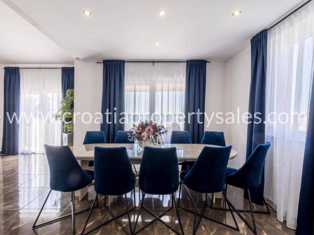 Villa with a swimming pool overlooking the sea and the Kaštela Bay. It is located on a plot of 800 m2 and has a beautifully arranged 386 m2 of living space on three levels. On the ground floor there is a swimming pool with a garden, a seating area and a barbecue.There is also a games room, an outdoor toilet and a cinema room with billiards. On the first floor there is a large living room with access to a terrace with a beautiful view of the sea and nature.The kitchen with the dining room is separated by a partition wall. On the ground floor on the north side there is one bedroom, a bathroom and a room leading to the garage and basement. Internal stairs lead to the gallery and the upper floor where there are 3 bedrooms, a bathroom on the north and a gym area on the south. On the north side of the courtyard it is possible to park 5 cars. The entire villa is fenced and offers privacy. It is located only 2 km from the center of a small beautiful town.