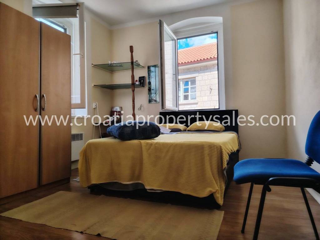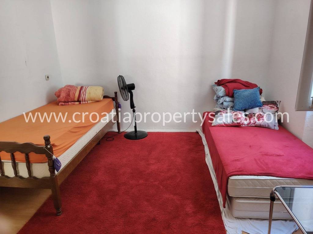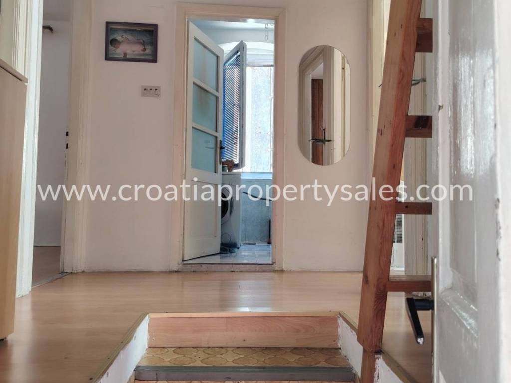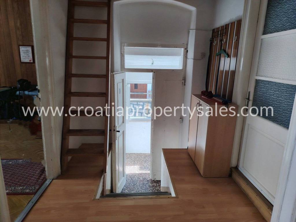 External stairs lead to the apartment on the first floor, which consists of a spacious hallway, three large bedrooms, kitchen and bathroom.The apartment has large openings and lots of light.Partial renovation is required.