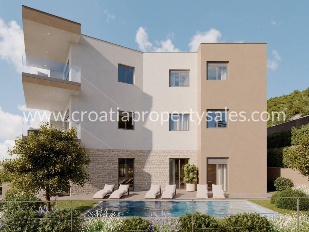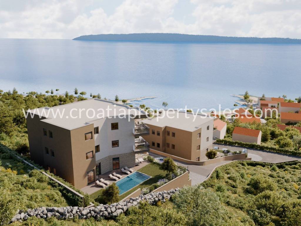 Apartments for sale with panoramic sea view. The apartments are located on the first and second floor of 75.75 m2 UNDER CONSTRUCTION, east side with parking space, covered balcony, open sea view, quiet location, access by car. The price of each apartment is 305,000 Euros. Modern architecture and top quality construction.Possibility of interior customization during construction. Top features of each apartment: Facade thermal insulation A+ Septic tank and bio-purifier for sanitary wastewater Staircase and stone sills on all openings ALU openings with electric shutters and mosquito nets Glass railing on balconies Heating and cooling via Multi split system Underfloor heating in bathrooms Top quality ceramics Fully equipped bathrooms with "Grohe" sanitary ware Ariston 80-liter water heater Video intercom Internet and TV installations in all rooms Varnished interior doors, hidden hinges, magnetic lock Fireproof entrance door, and apartment door burglar-proof and fireproof Automatic smoke extraction system in staircase