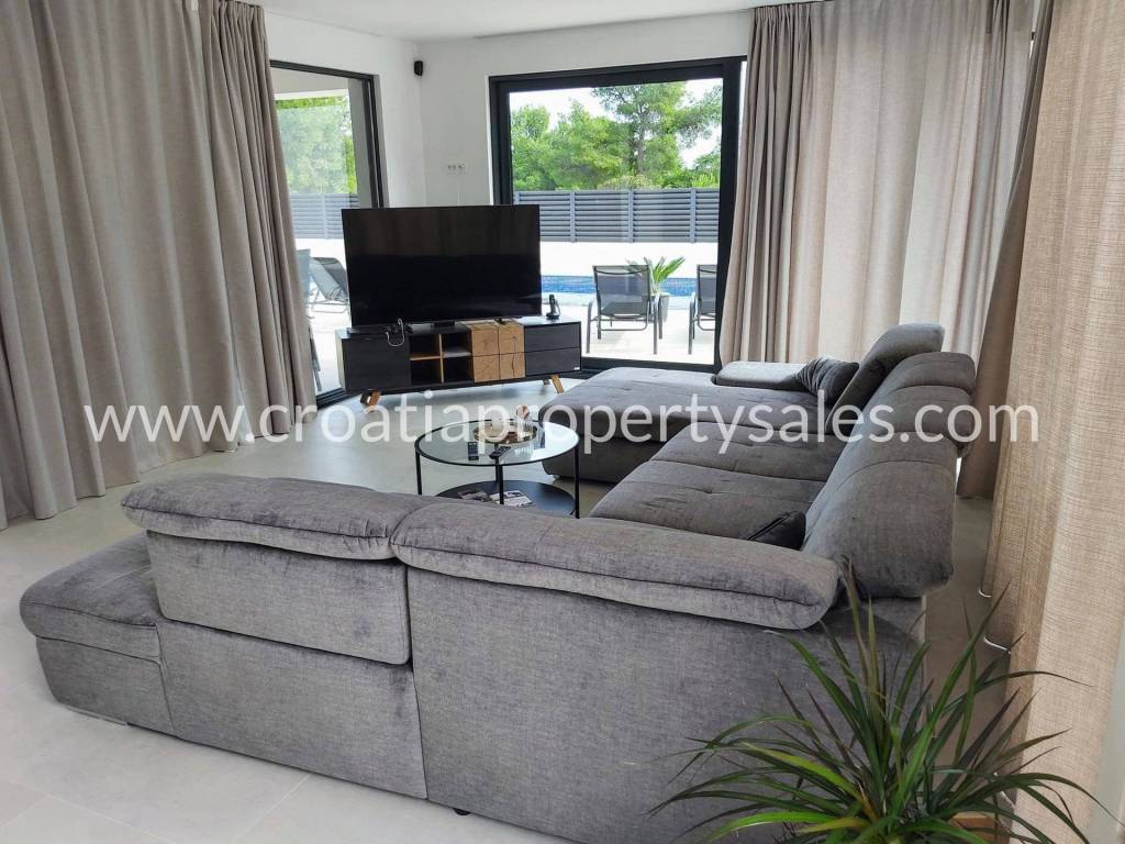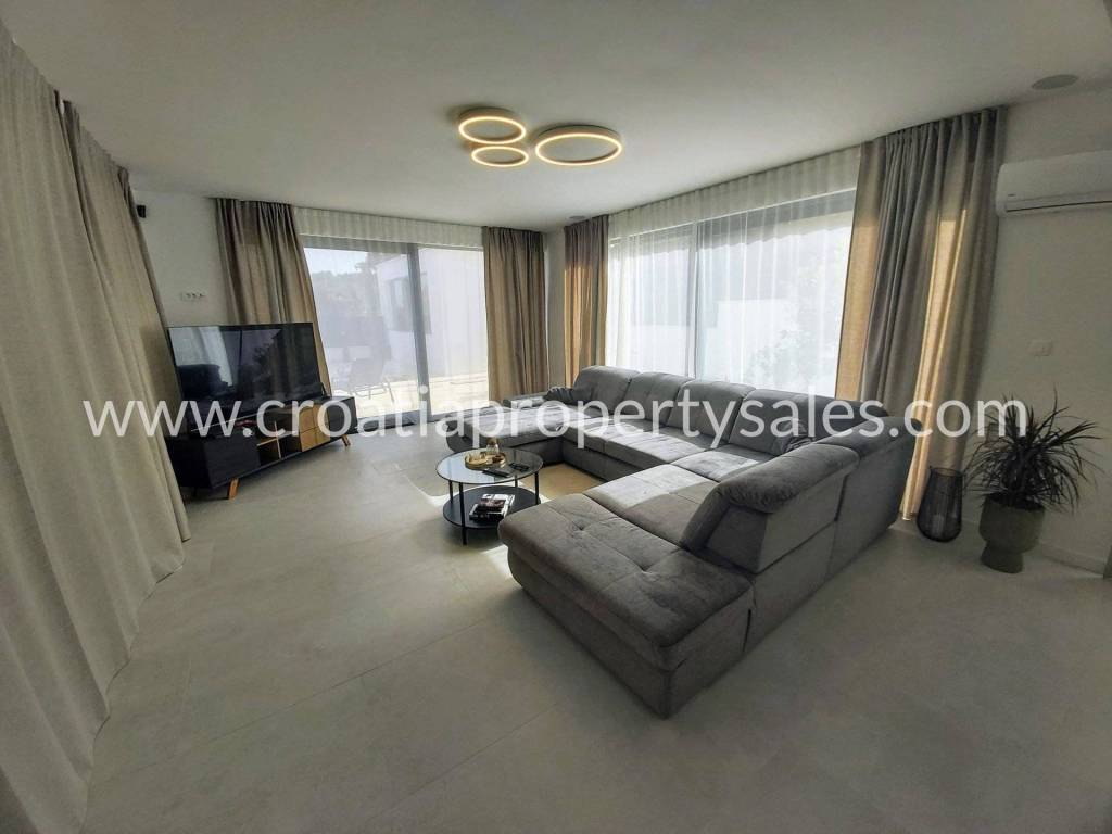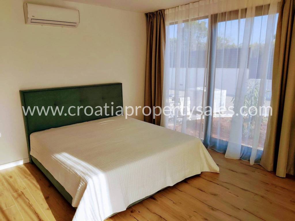 The villa is fully equipped to the standard for 4-star categorization. Each of the 4 rooms has double beds, bedside tables, lamps, a coffee table with 2 armchairs, custom-made built-in wardrobes, glass walls with curtains and blinds, access to the balcony, its own toilet with walk-in showers with a glass wall, heating and other sanitary facilities.