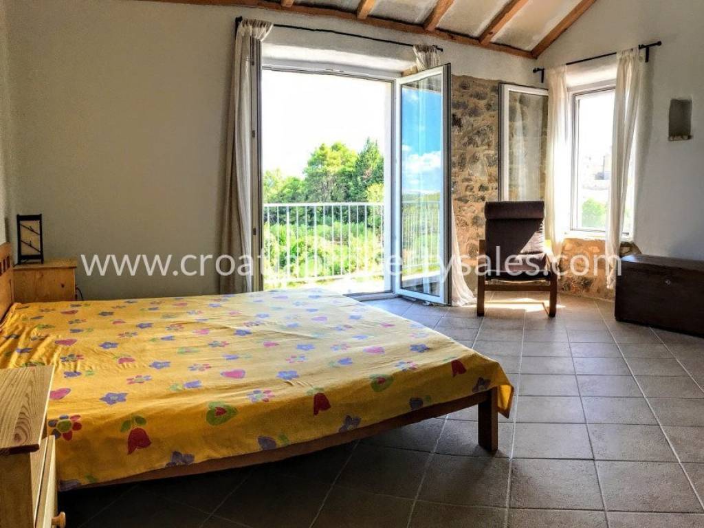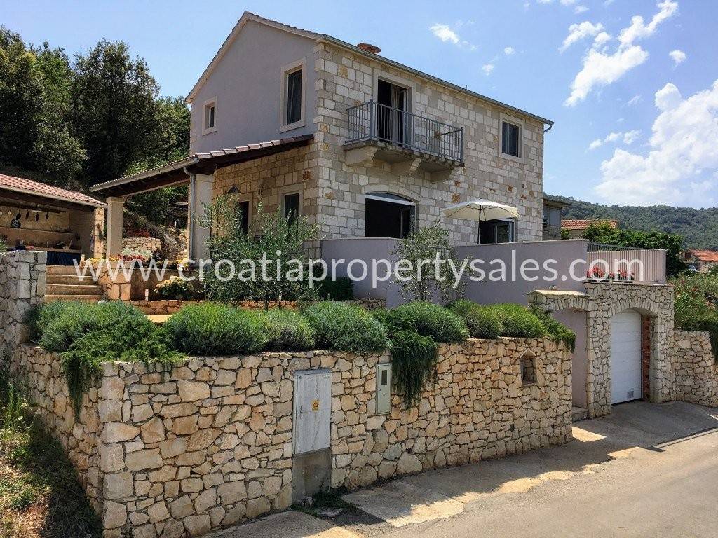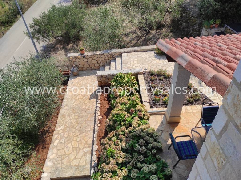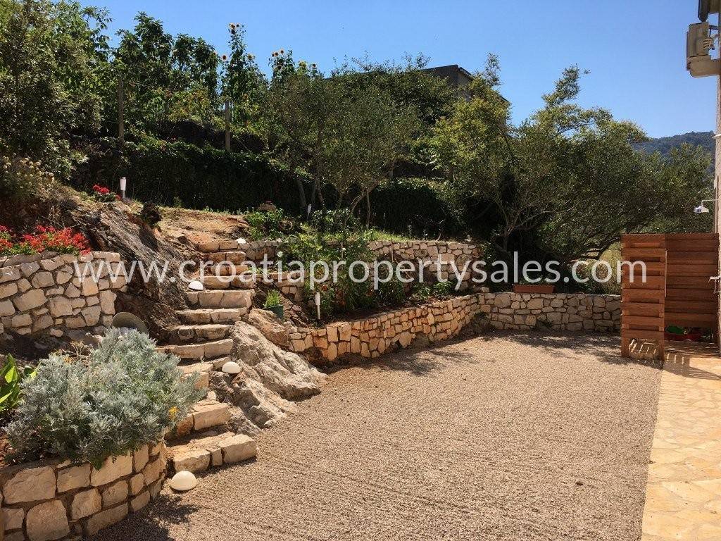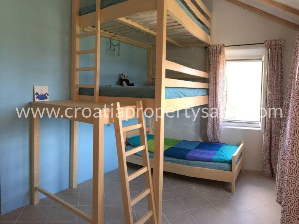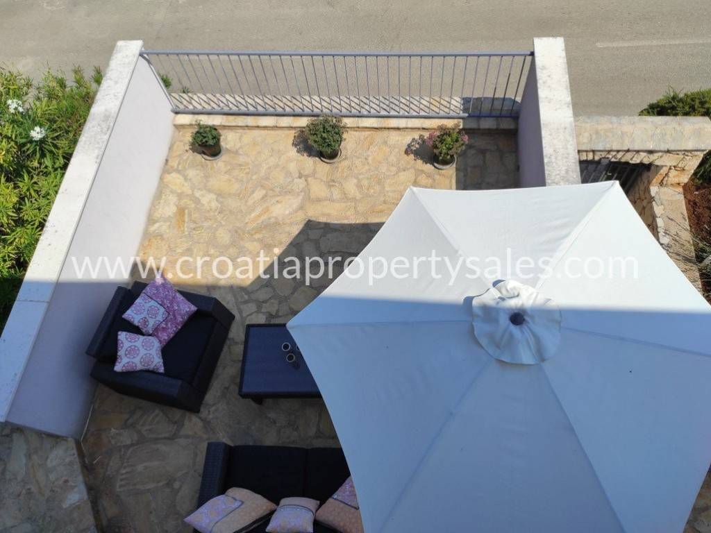 Detached family house/holiday house, with sea view. The house consists of two floors. The ground floor is an open space with a living room, dining room, kitchen and toilet. A lot of light comes through the windows and balcony doors and illuminates the room. Internal stairs lead to the first floor where there are three bedrooms and a bathroom with shower and toilet. The balcony on both floors offers a beautiful view of the neighboring island and the village. A large outdoor summer kitchen ideal for pleasant barbecue evenings. The house and garden are very well maintained and offer privacy. Garage and parking space available.