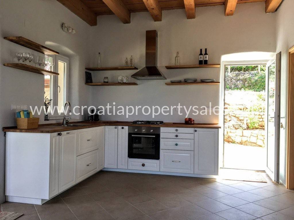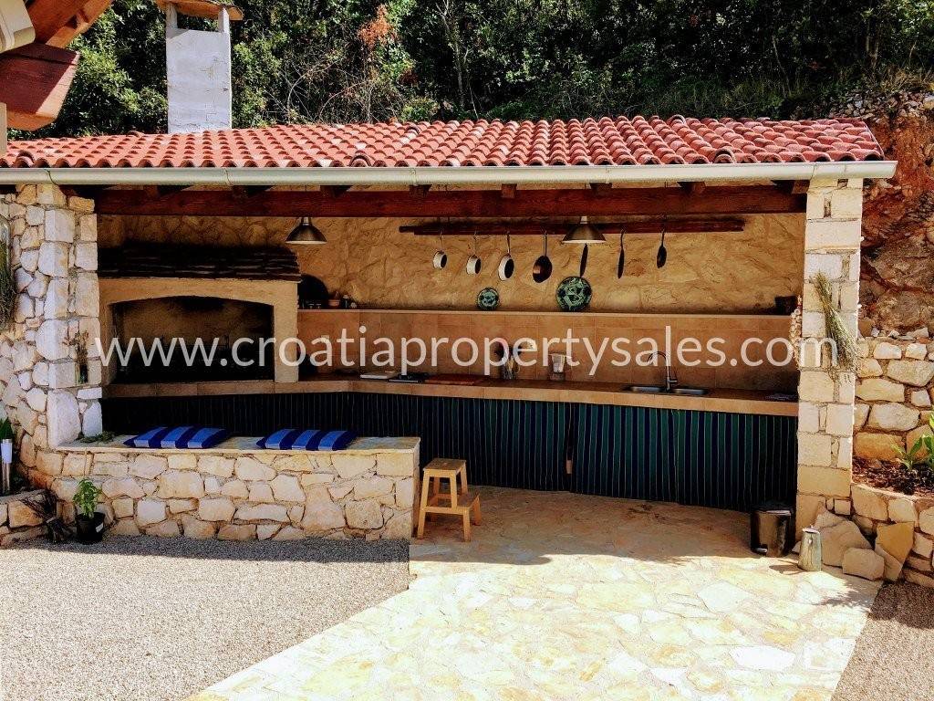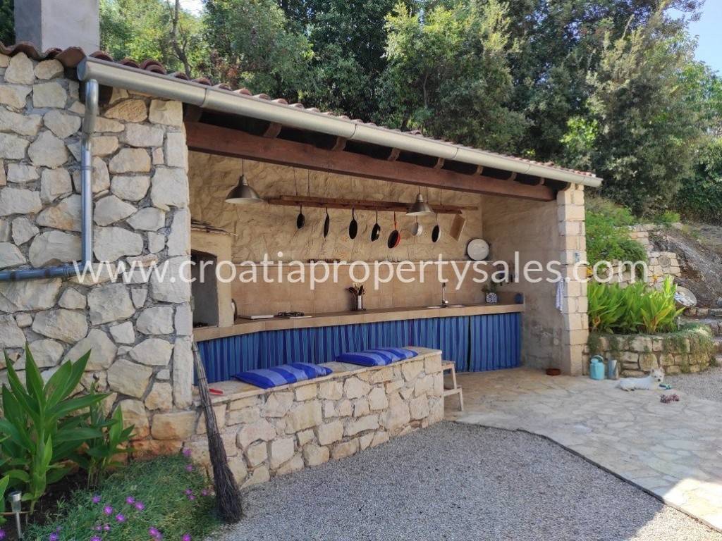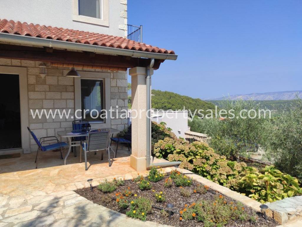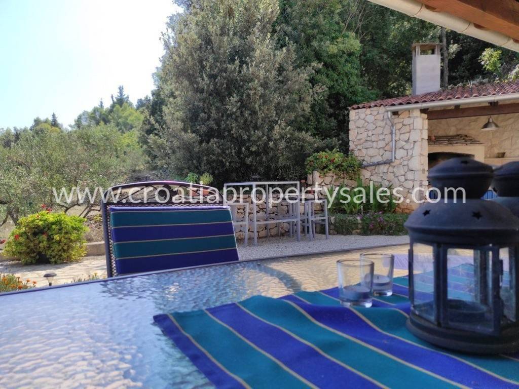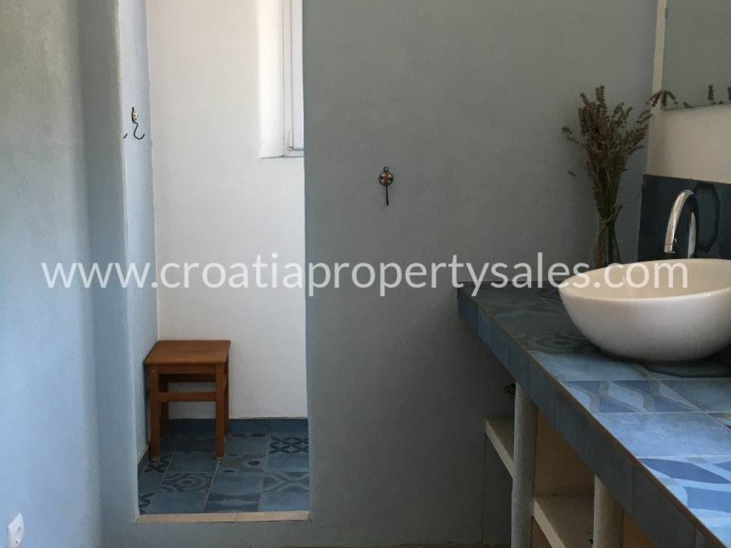 Detached family house/holiday house, with sea view. The house consists of two floors. The ground floor is an open space with a living room, dining room, kitchen and toilet. A lot of light comes through the windows and balcony doors and illuminates the room. Internal stairs lead to the first floor where there are three bedrooms and a bathroom with shower and toilet. The balcony on both floors offers a beautiful view of the neighboring island and the village. A large outdoor summer kitchen ideal for pleasant barbecue evenings. The house and garden are very well maintained and offer privacy. Garage and parking space available.