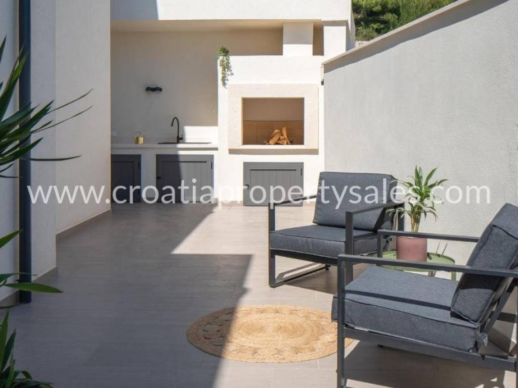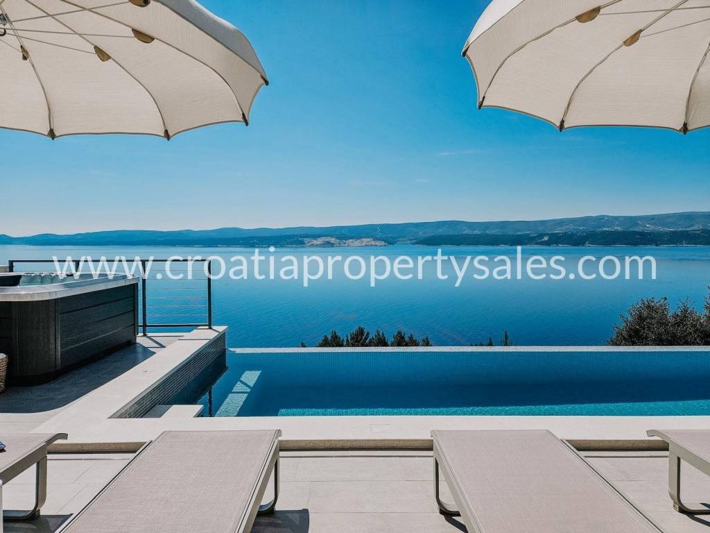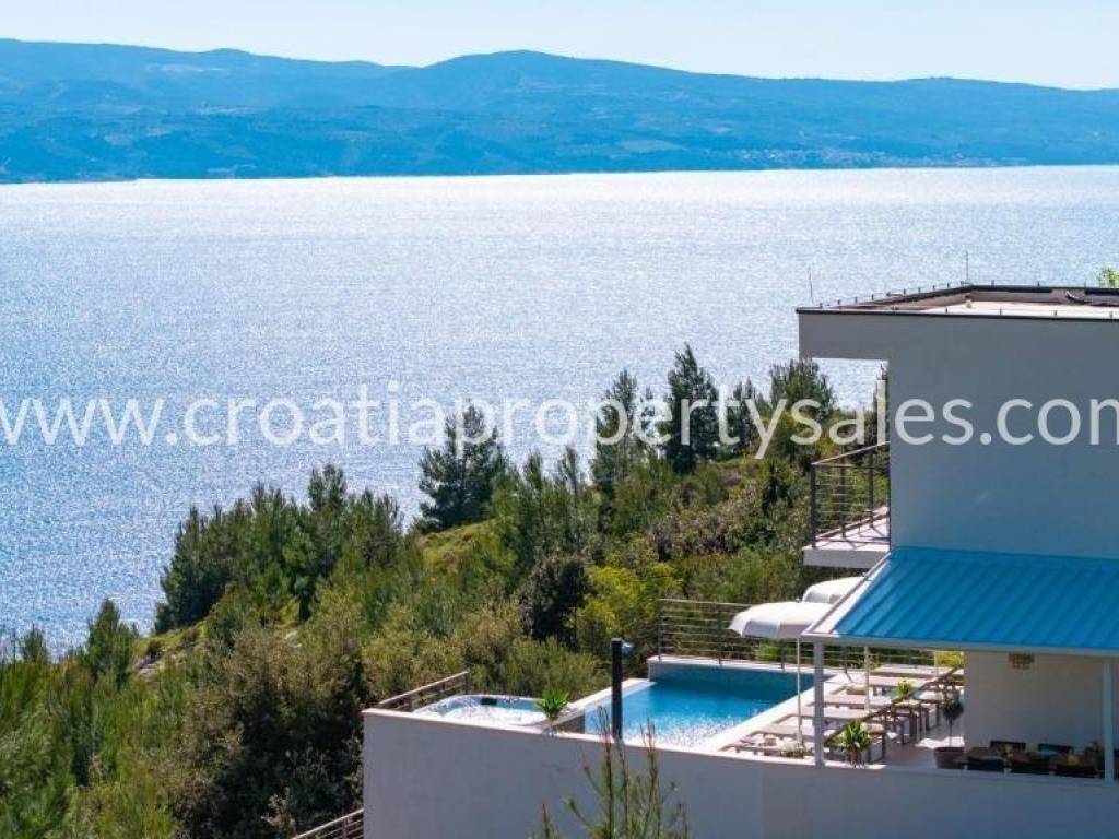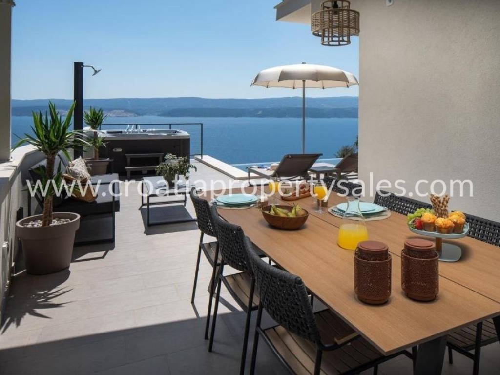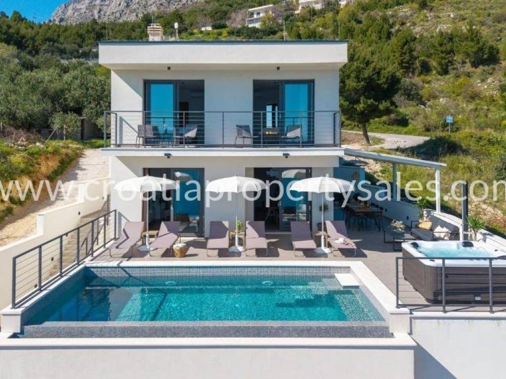 A wonderful, newly built villa with an open panoramic view that cannot be closed. We offer for sale a modern villa located in a small, quiet place on the Omis Riviera. The villa consists of a ground floor and 2 floors. On the ground floor of the villa there is an unfinished open space that can be used as a tavern or can be arranged as a space for playing and socializing. The ground floor also has an outdoor terrace. External stairs lead to the first floor of the villa where there is a bathroom, laundry room, kitchen, dining room and an open concept living room facing the southern terrace where there is a sundeck and swimming pool, and an outdoor kitchen. Stone-paved stairs lead to the second floor, where there are 3 bedrooms and two bathrooms, one of which is attached to the master bedroom. The house is sold without furniture, which allows the future owner to adapt the furniture to his wishes and taste. Four outdoor parking spaces are located on the north side of the villa, and garages can also be purchased upon request and upon agreement with the owner.