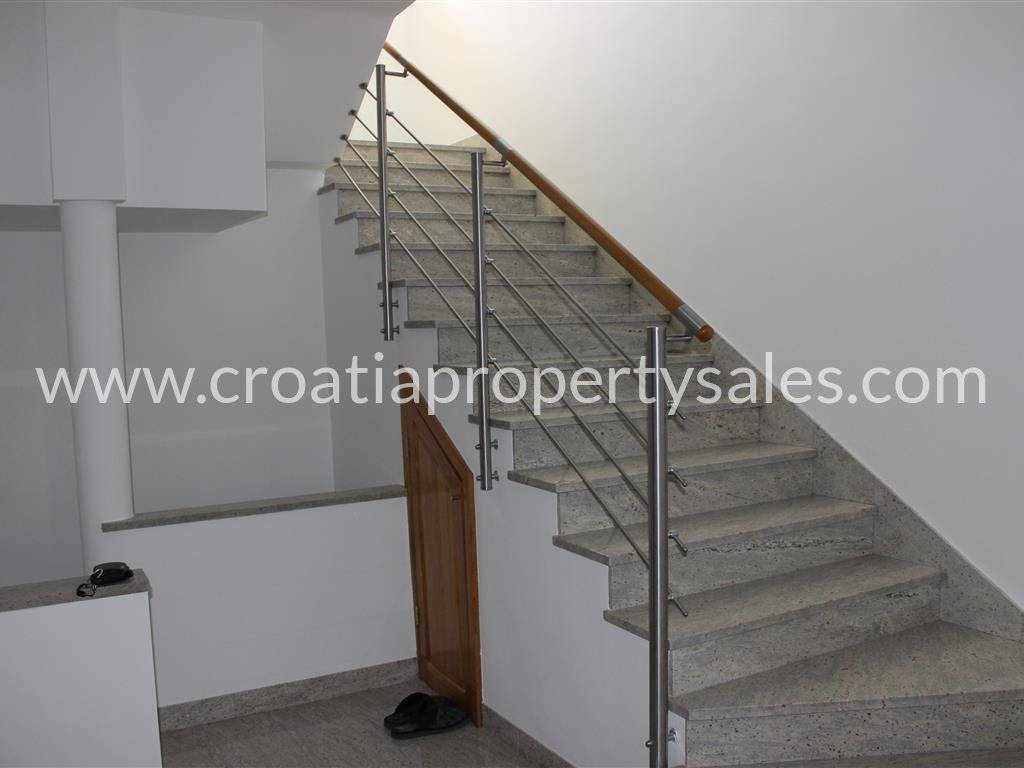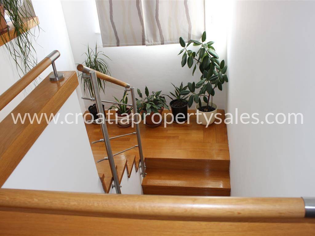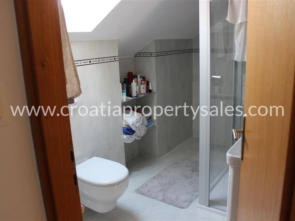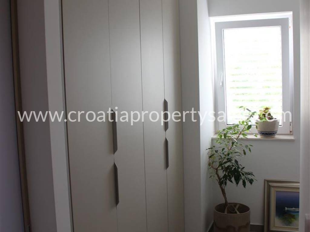 On the ground floor of the house there is an apartment with an area of 80 m2, completely modernly furnished, consisting of 2 bathrooms, 2 bedrooms, a kitchen, a dining room and a living room from which there is access to the closed balcony, as well as to the sunbathing area and swimming pool.