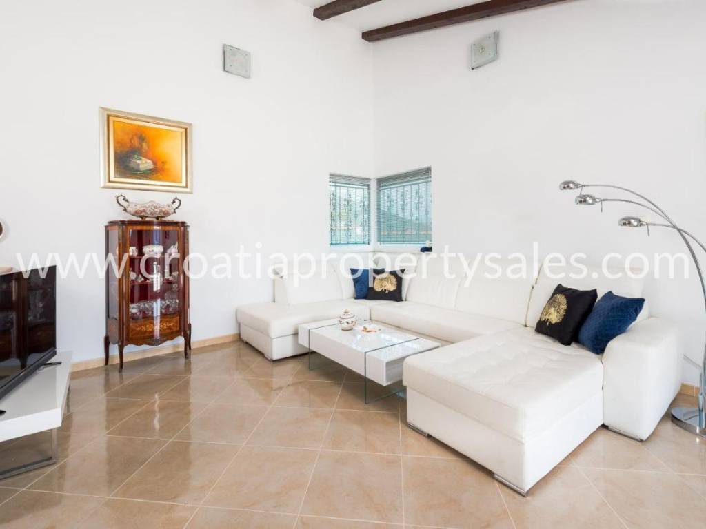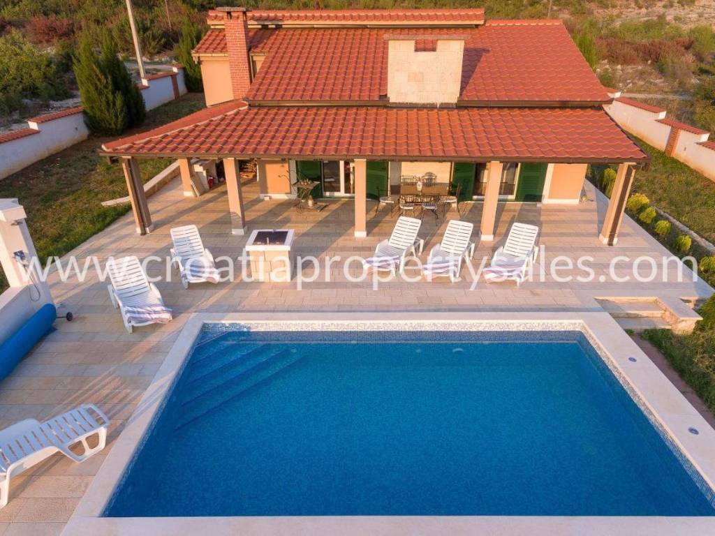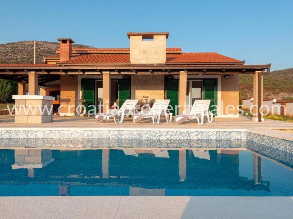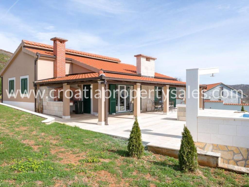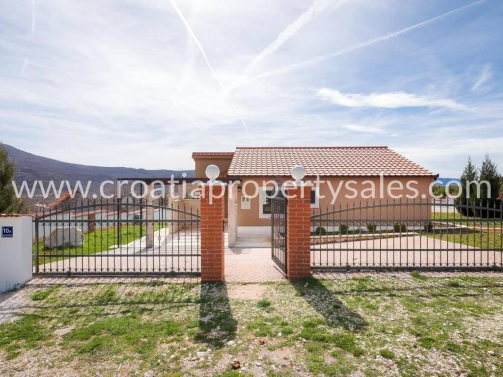 Detached house with swimming pool with a beautiful view of the mountains. It was built in 2017, on a plot of 1000 m2. The house consists of one floor on which there is a spacious living room with dining area, three bedrooms and a bathroom. The interior is decorated in neutral colors with a combination of modern and classic. Mediterranean plants, a maintained garden and a swimming pool offer a wonderful atmosphere for socializing. It is ideal for family gatherings, but it also has tourist potential. Seaside is about 25 minute drive away.