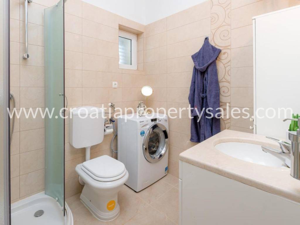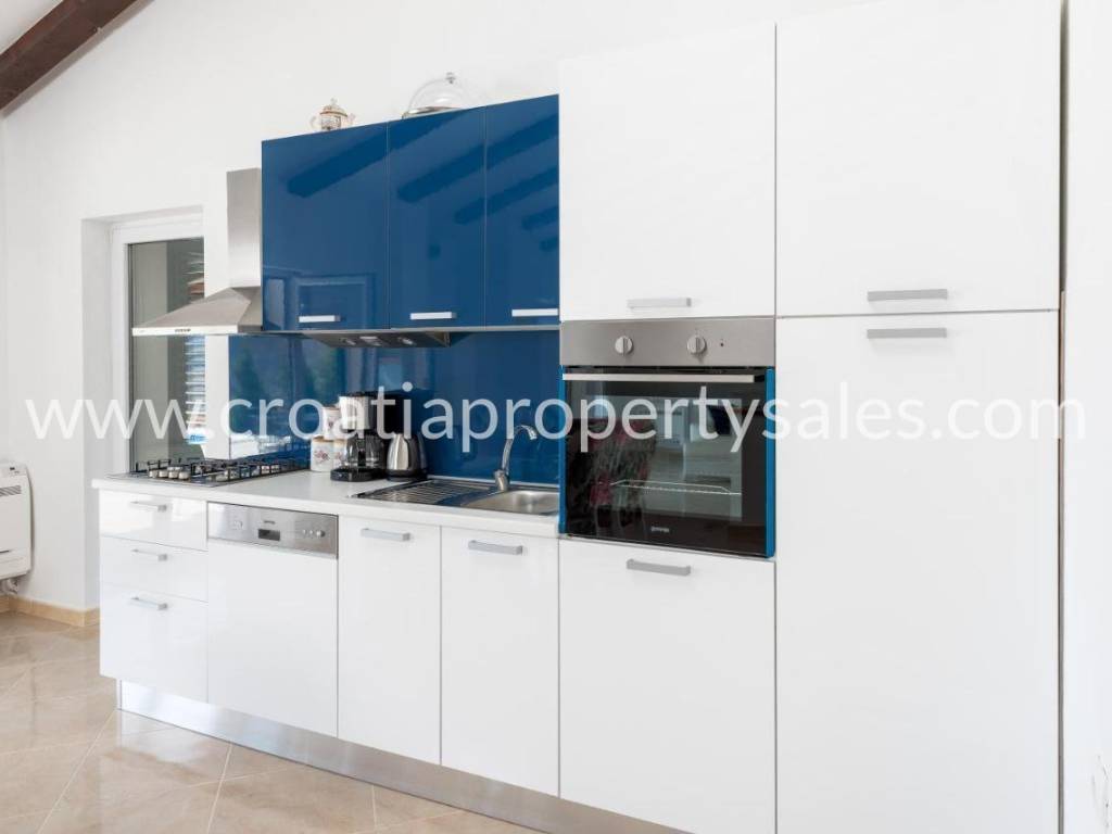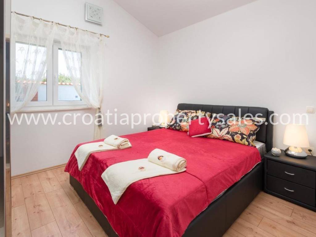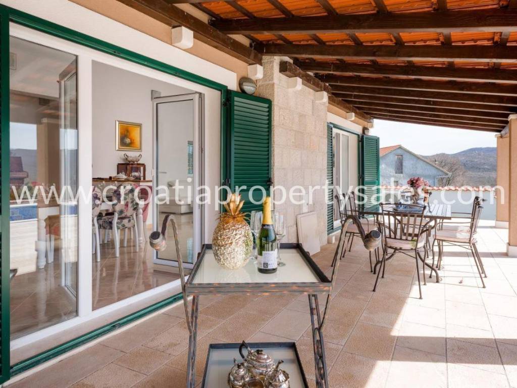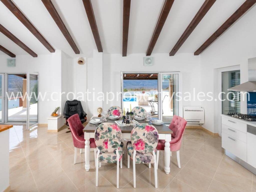 Detached house with swimming pool with a beautiful view of the mountains. It was built in 2017, on a plot of 1000 m2. The house consists of one floor on which there is a spacious living room with dining area, three bedrooms and a bathroom. The interior is decorated in neutral colors with a combination of modern and classic. Mediterranean plants, a maintained garden and a swimming pool offer a wonderful atmosphere for socializing. It is ideal for family gatherings, but it also has tourist potential. Seaside is about 25 minute drive away.