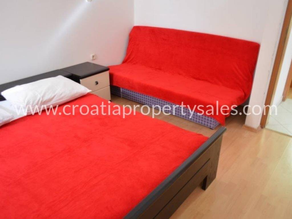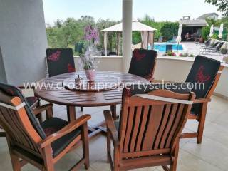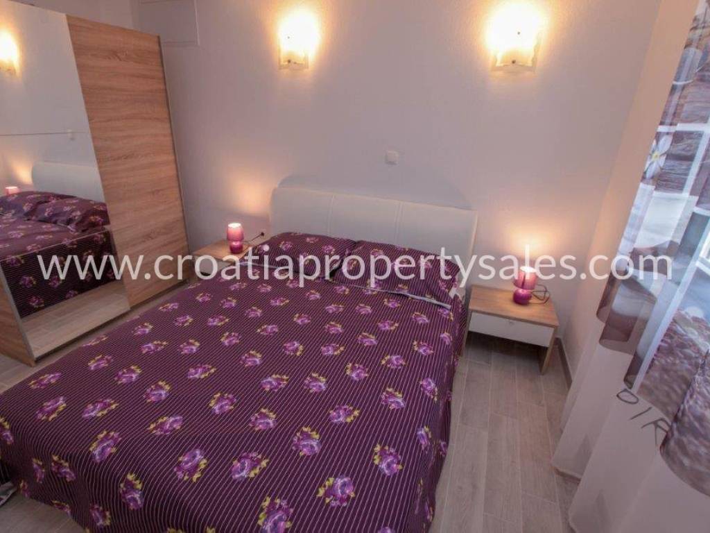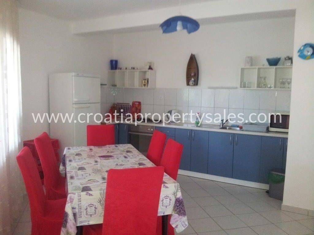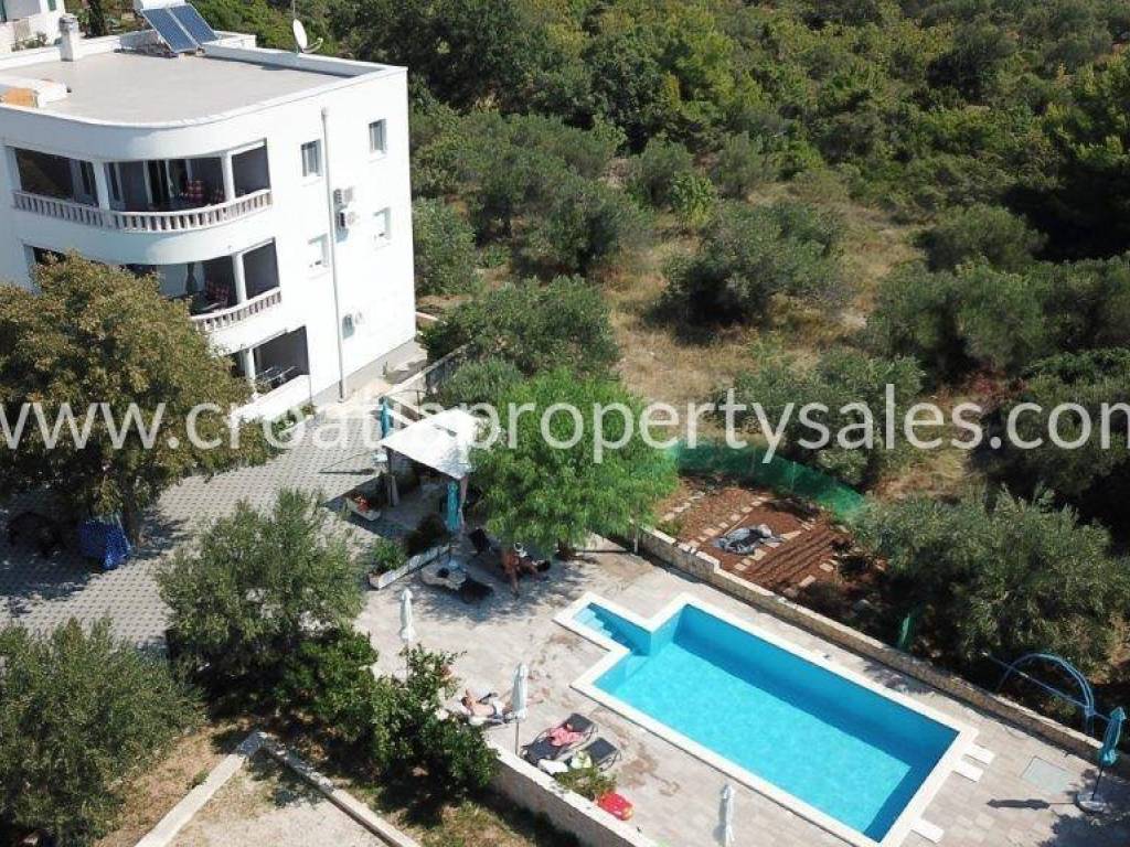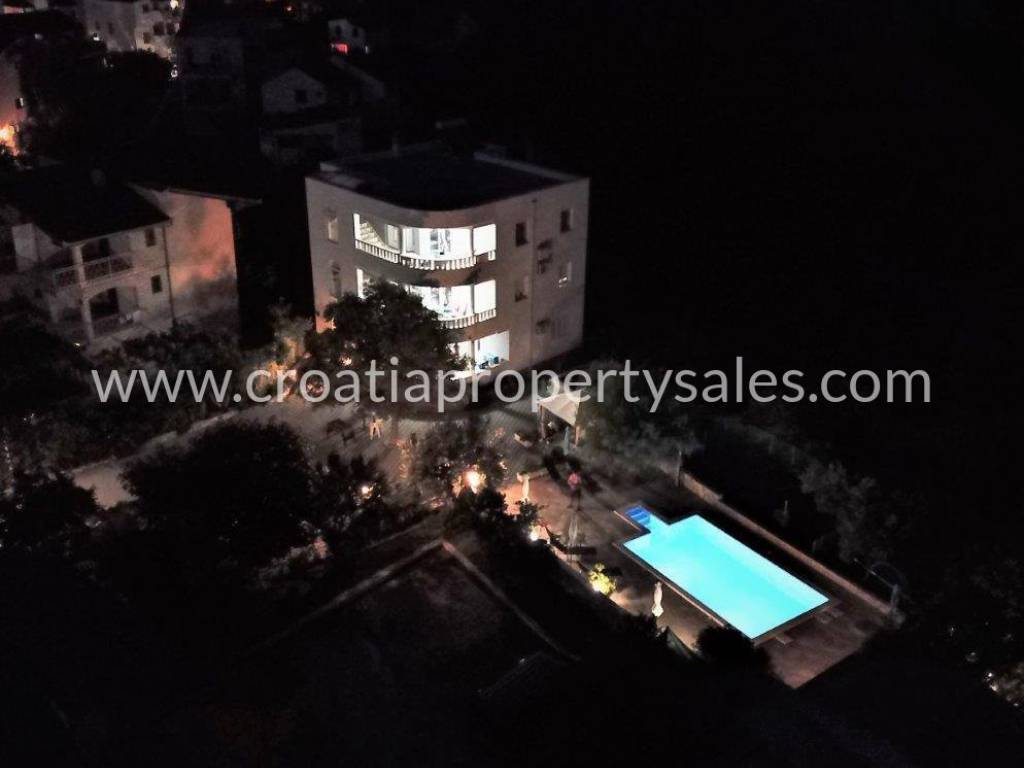Apartment house in the first row to the sea on a plot of 1100 m2. The house is surrounded by Mediterranean plants, and within the plot there is a swimming pool with sun deck and a summer kitchen of 60 m2. The living area of the house is 390 m2. In the basement of the house there is a traditional space decorated in Dalmatian style and an additional studio apartment. The ground floor consists of a spacious two bedroom apartment. On the first and second floor there are two one-bedroom apartments, each with a terrace with a beautiful sea view. The roof of the house is a large terrace with prepared jacuzzi installations. The sea view is spectacular. Although located in the first row to the sea, only 30 m from the beautiful beach, the house still offers privacy and peace. The house has all the necessary infrastructure and is located near all necessary facilities.