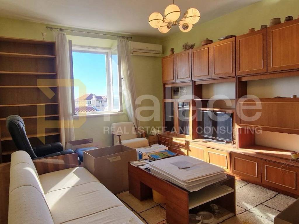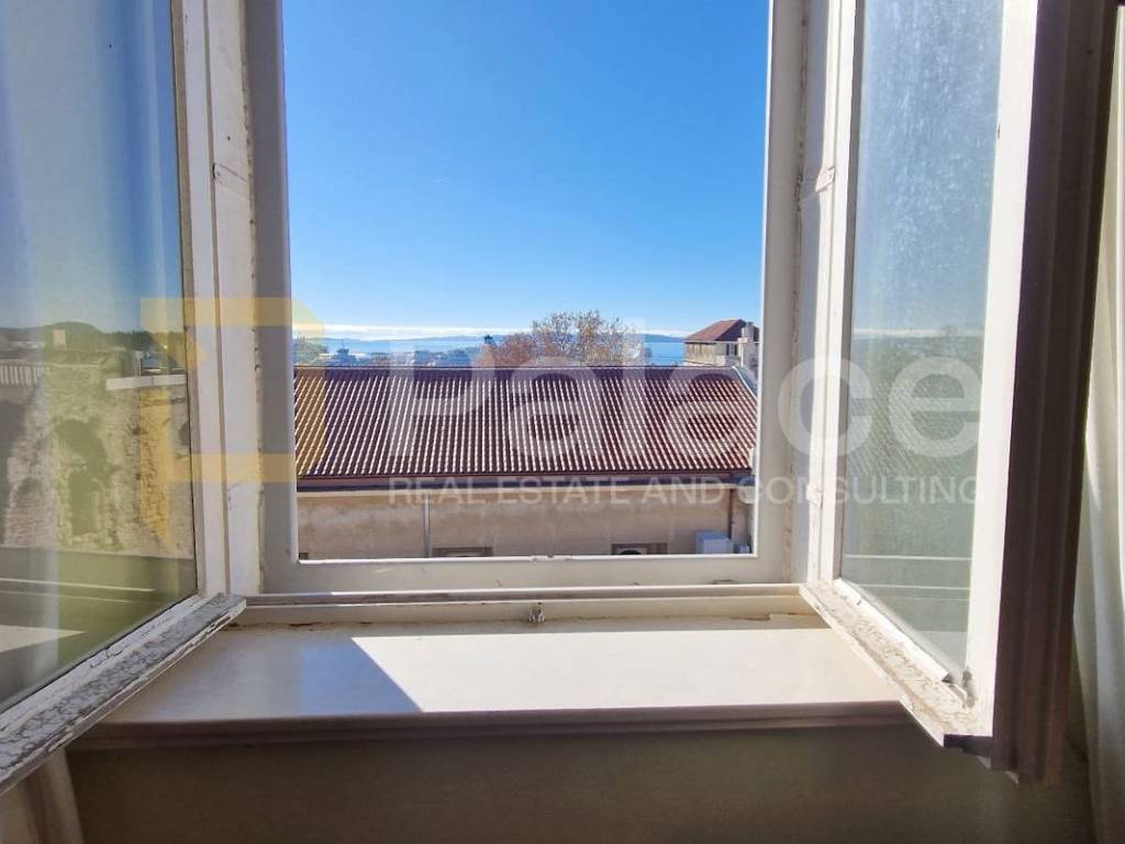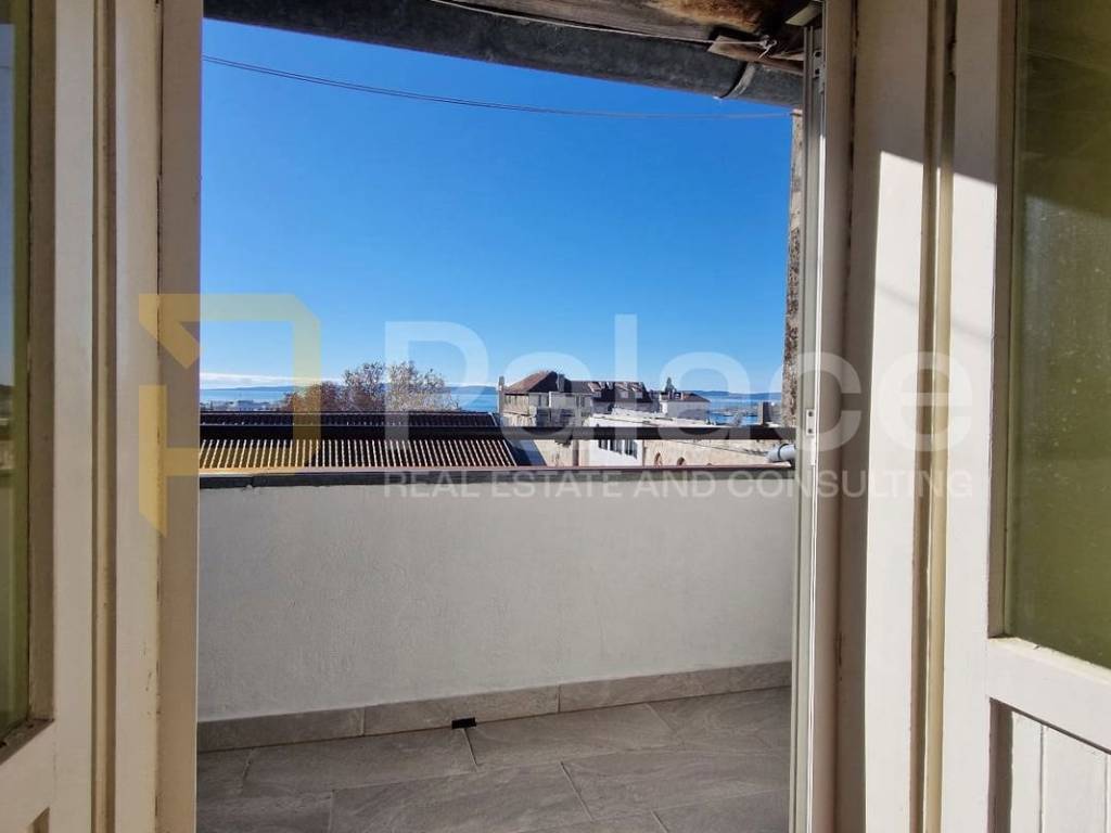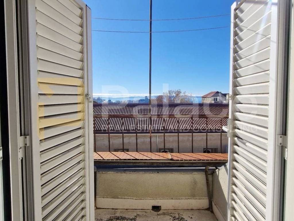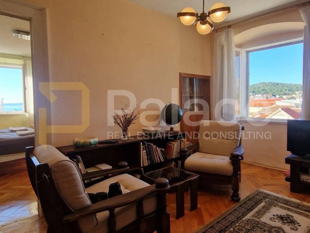 This exceptional property consists of four bedrooms, a kitchen with a dining area, a living room, a hallway, a bathroom, and a separate toilet, as well as two charming balconies providing views of the thousand-year-old walls of Diocletian's Palace, the Split waterfront, and the sea.