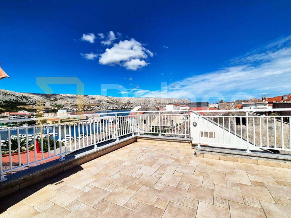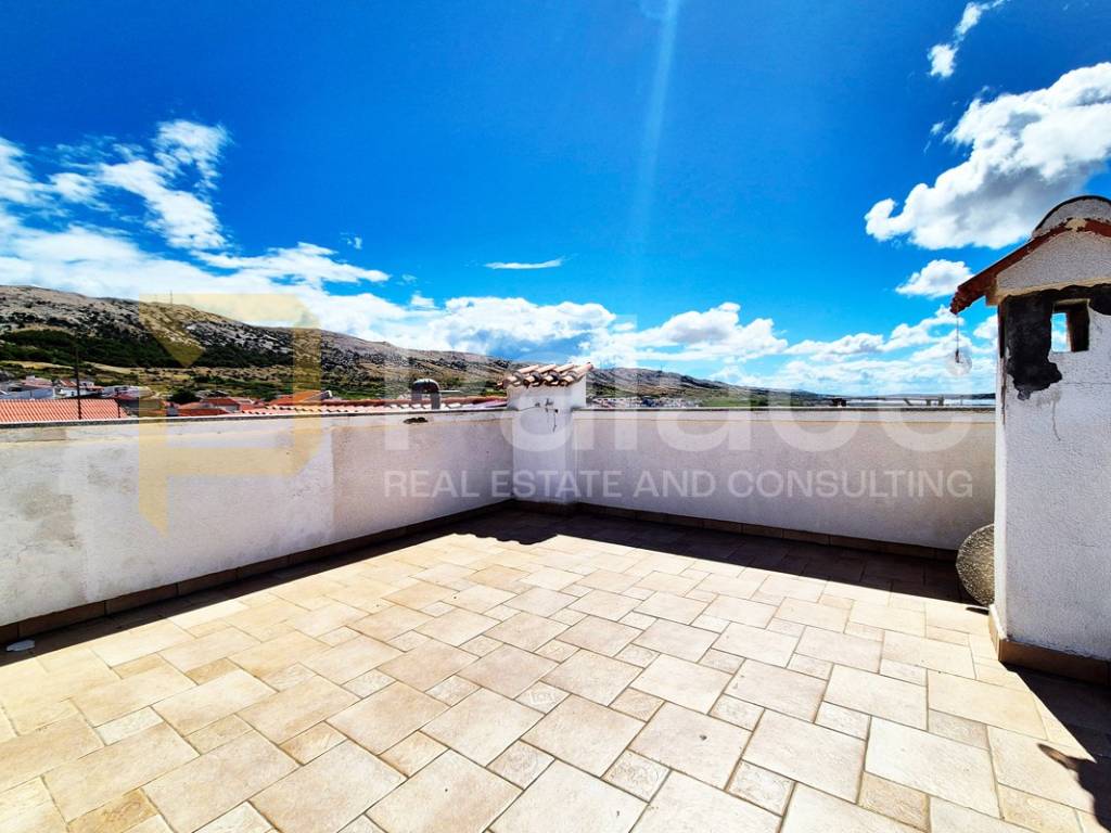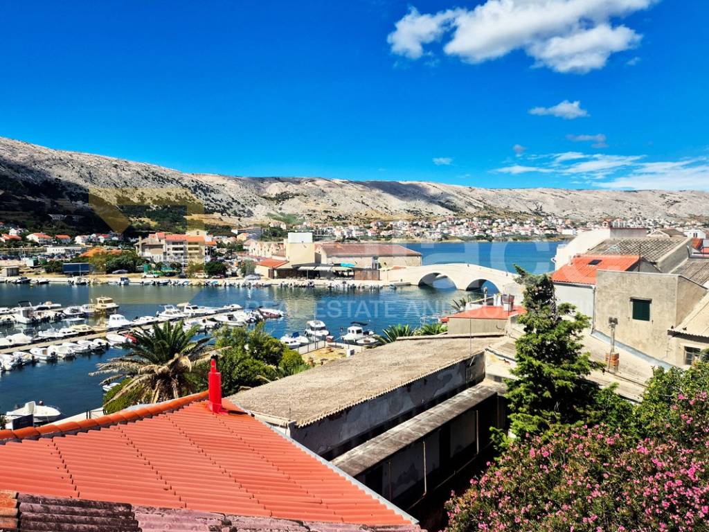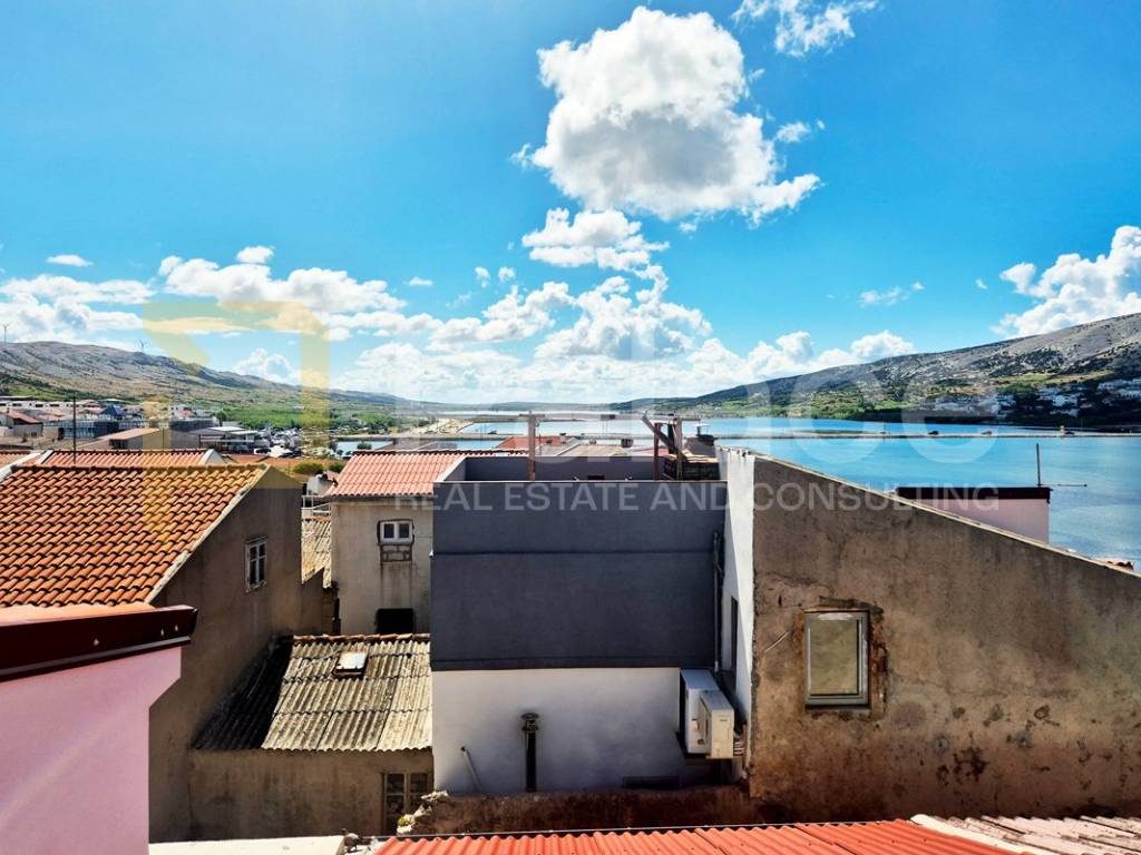 A stone house located on the island of Pag is for sale, situated in a quiet street only 50 meters from the town center. The house is a two-story building consisting of a ground floor and two levels, suitable for a large family or as a vacation home. The space is functional and airy, with plenty of light and warmth due to the combination of stone and wooden elements, and the floors are connected by an internal staircase.
