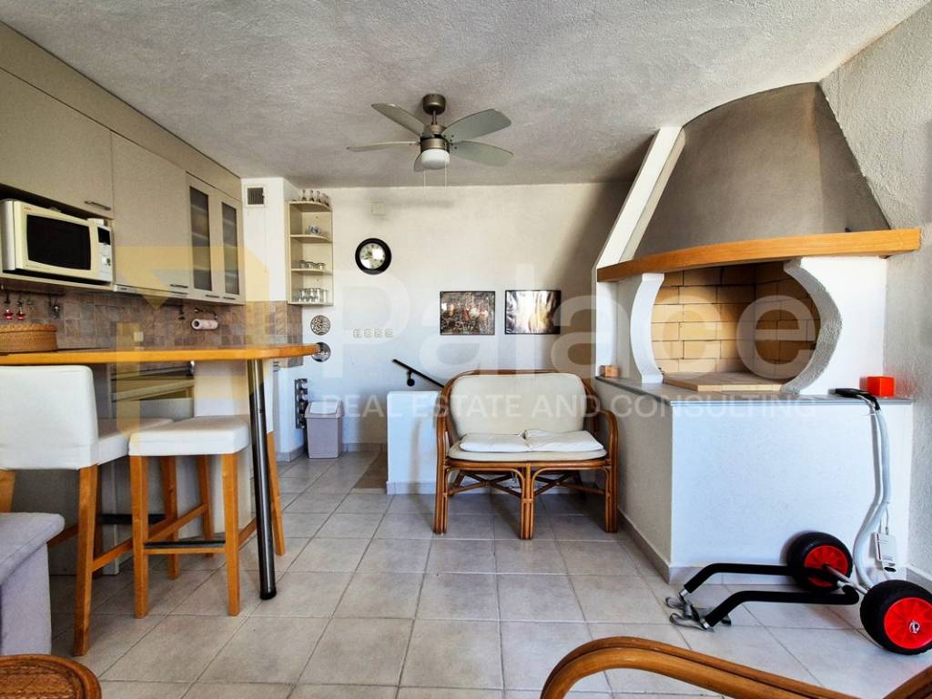 On the ground floor, in addition to the living room, kitchen with dining area, and guest toilet, there is a wine cellar and a summer kitchen with its own storage. The bedrooms, including the master bedroom with its own terrace and bathroom, are located on the first and second floors, totaling four bedrooms. The second floor also features a small living room with its own kitchen and fireplace, leading to a rooftop terrace with sea views.