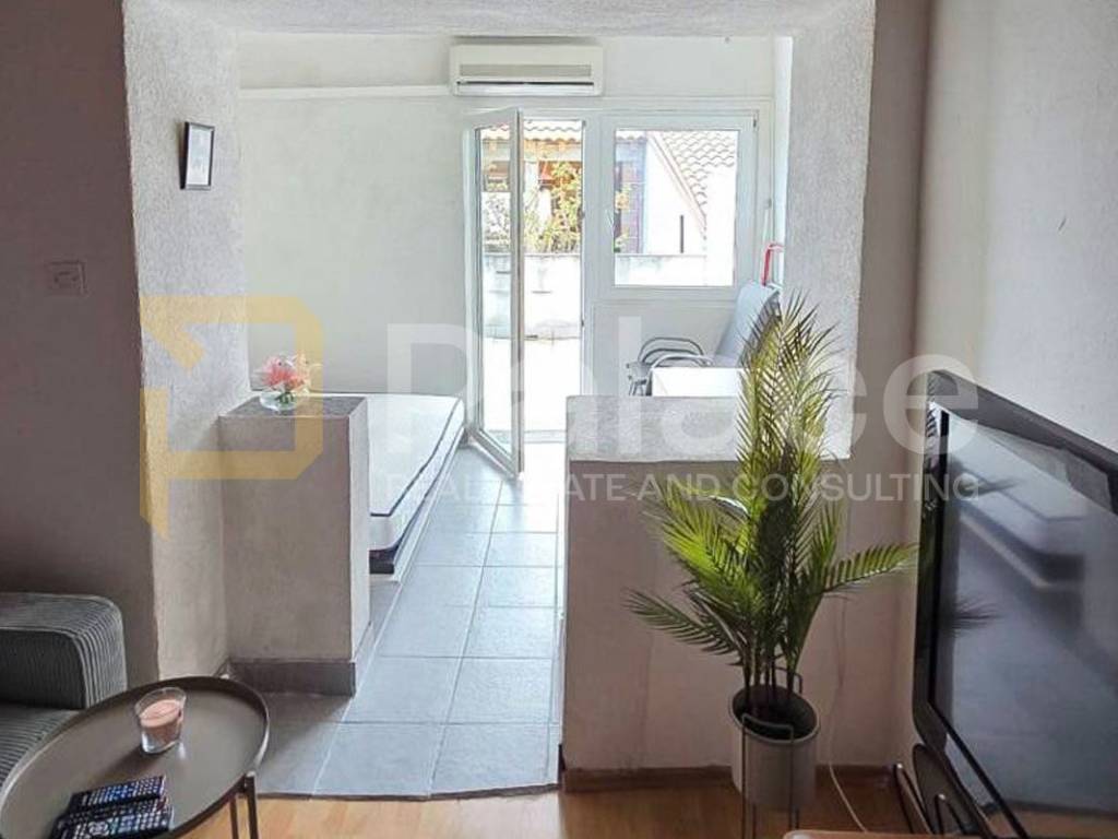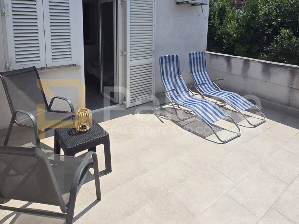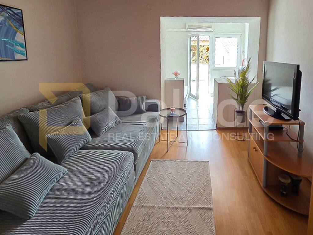 The apartment is situated on the ground floor of the building and consists of a kitchen with a dining area, a living room with a bedroom, a bathroom, and a hallway, with a total living area of 41.4 m. The kitchen and living room feature two sofa beds, providing additional sleeping space and comfort during your stay. The living area leads to a 12.9 m uncovered terrace, perfect for outdoor relaxation, making a total of 54.3 m of useful space.
