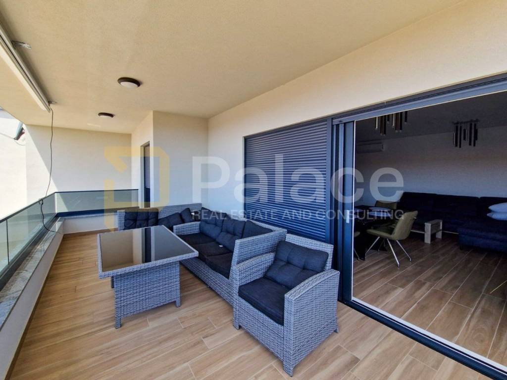 The apartment is equipped with underfloor heating in all rooms and air conditioning units in each room, providing an ideal temperature throughout the year. Anthracite exterior carpentry and white interior, electric shutters, and insect screens further contribute to the quality of living.