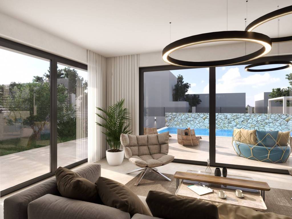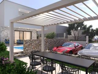 The villa is equipped with PVC carpentry, underfloor heating is installed throughout the entire ground floor and through the bathrooms, and the facade is made in combination with stone.