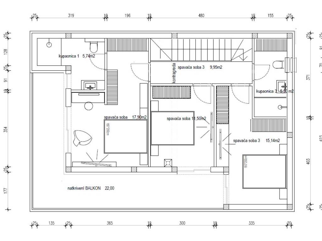 On the ground floor, there are practical storage rooms and a laundry room, and the stairs lead you to the first floor of the villa. There are three bedrooms and two bathrooms on the first floor. The master bedroom also has its own bathroom. From two bedrooms you have access to a covered balcony of 22 m2.
